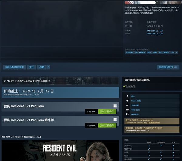 随着上市日期临近,该作在 Steam 上的愿望单已突破 500 万,国区标准版348元,豪华版398元,提前预购的玩家可免费获得格蕾丝专属 “天启” 皮肤。