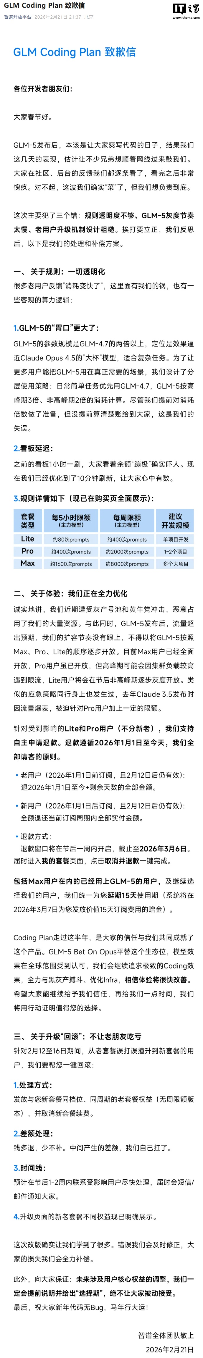 智谱发布 GLM Coding Plan 致歉信:规则透明度不够、GLM-5 灰度节奏太慢、老用户升级机制设计粗糙