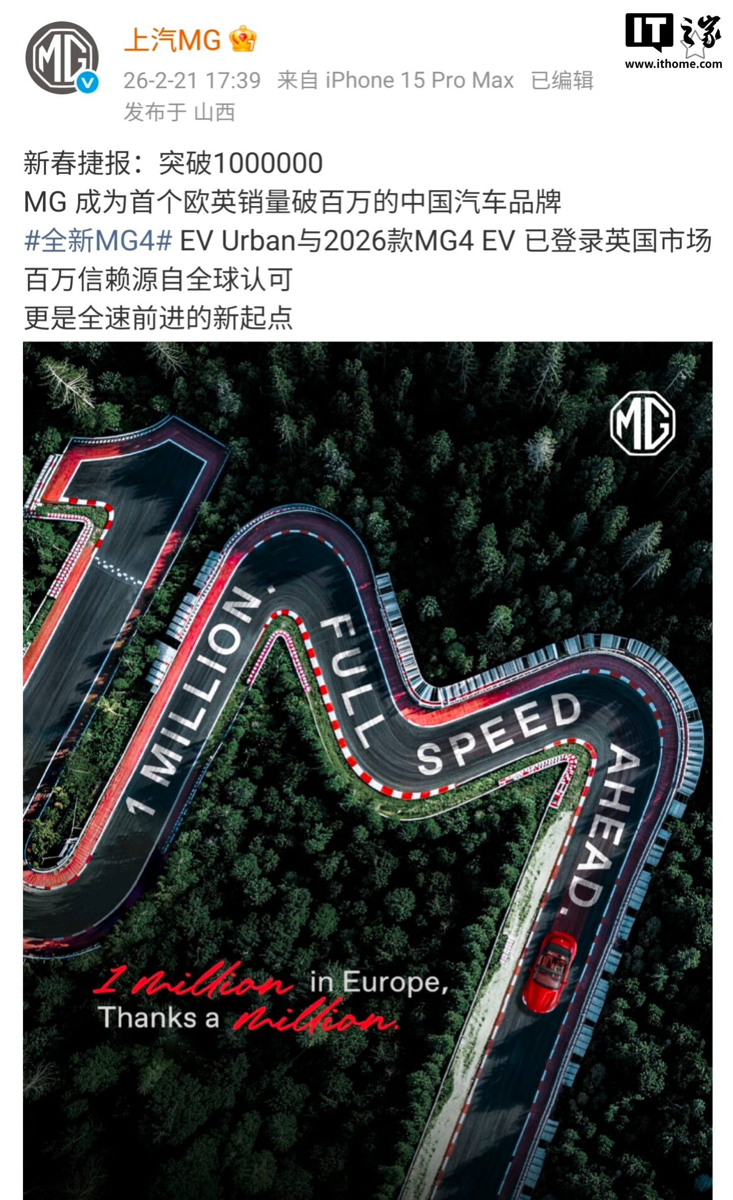 IT之家 2 月 22 日消息,2 月 21 日晚,上汽名爵宣布 MG 成为首个欧英销量破百万的中国汽车品牌,全新 MG4 EV Urban 与 2026 款 MG4 EV 已登陆英国市场。