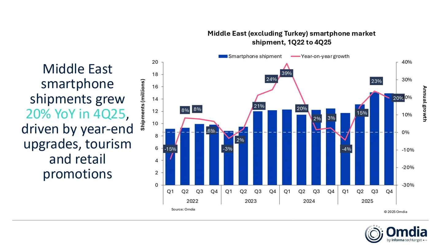 而中东市场的 2025 全年智能手机出货规模增幅为 13%,连续三年高于一成;2025Q4 出货 1490 万台,同比增长 20%,第三个季度实现两位数增长。与拉美类似,三星(同比 +41%)与荣耀(同比 +94%)是当地去年表现最为耀眼的手机厂商。