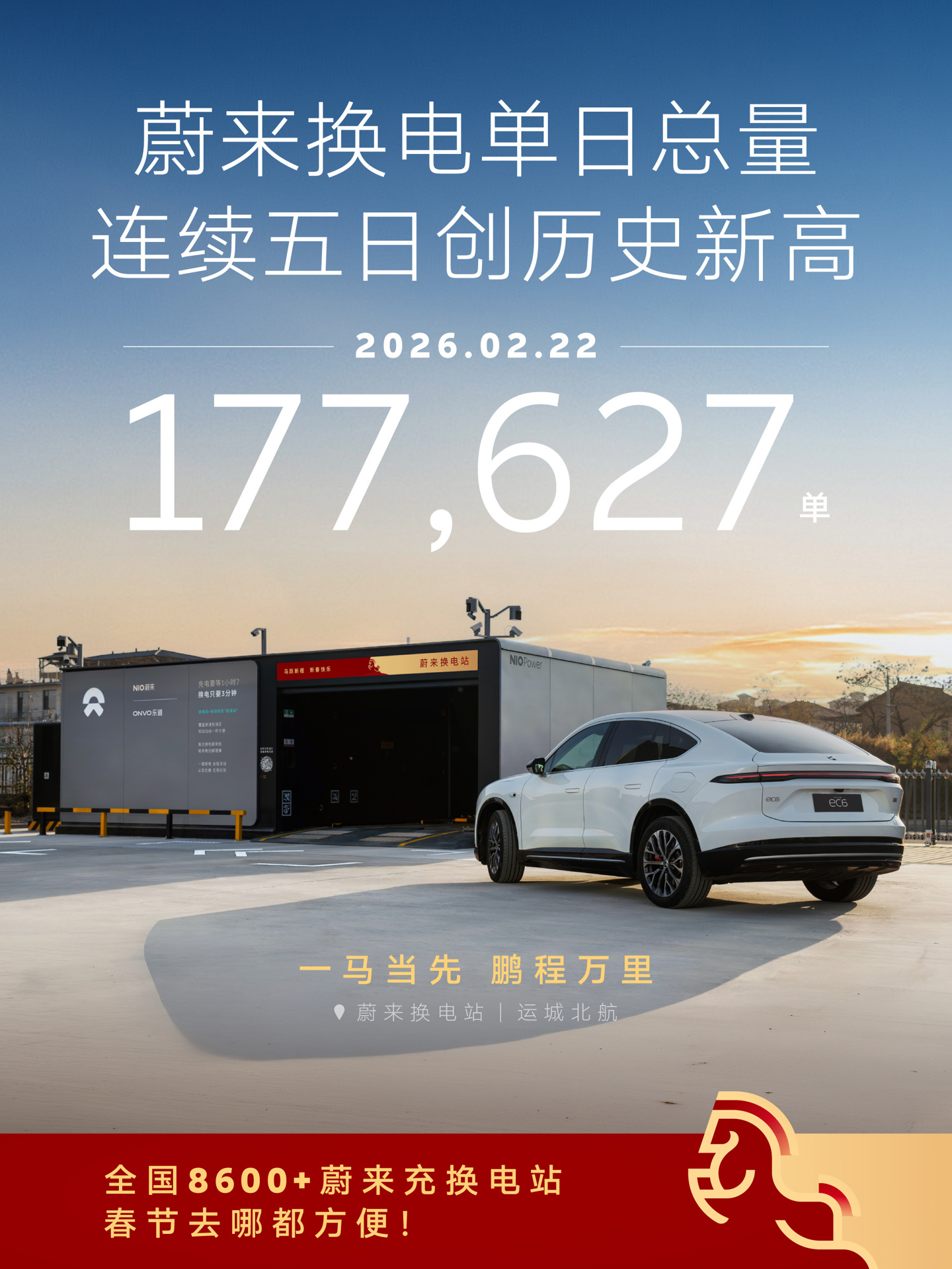 IT之家 2 月 23 日消息,蔚来换电再次刷新纪录:2026 年 2 月 22 日大年初六,蔚来换电单日总量达 177,627 次,又创历史新高,平均不到 0.5 秒就有一台车完成换电。