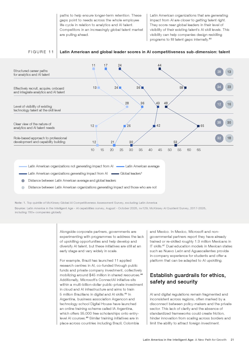 人才可用性仍然是最重大的挑战之一。虽然跨国公司正将拉丁美洲视为其技术交付中心的所在地,但本地组织发现难以竞争。该地区的公司必须为人工智能人才创造有吸引力的报价和职业发展路径,并培训其所有层级的现有员工。