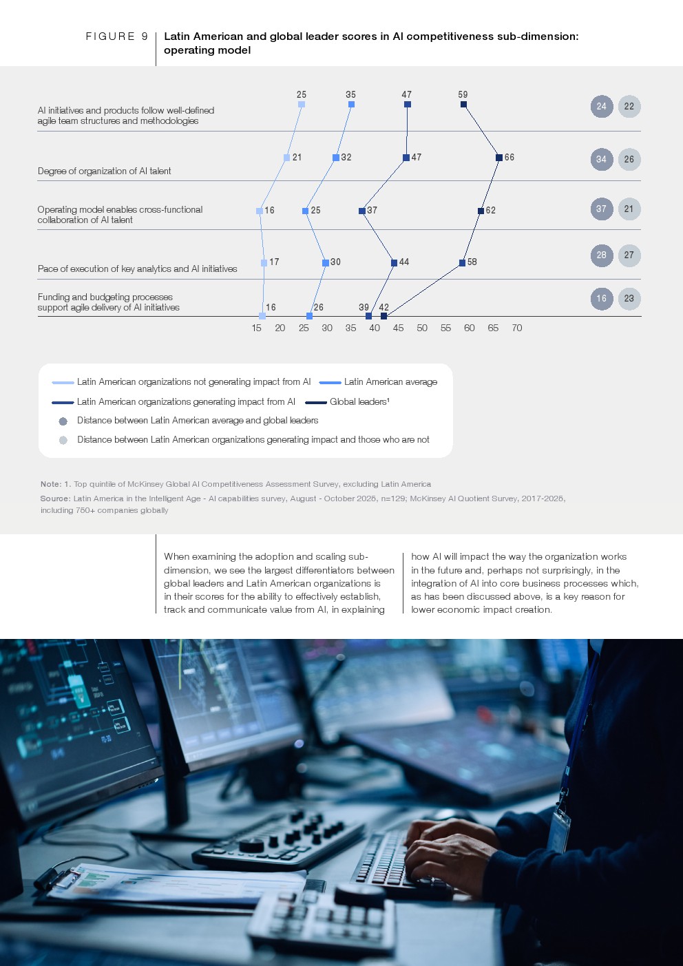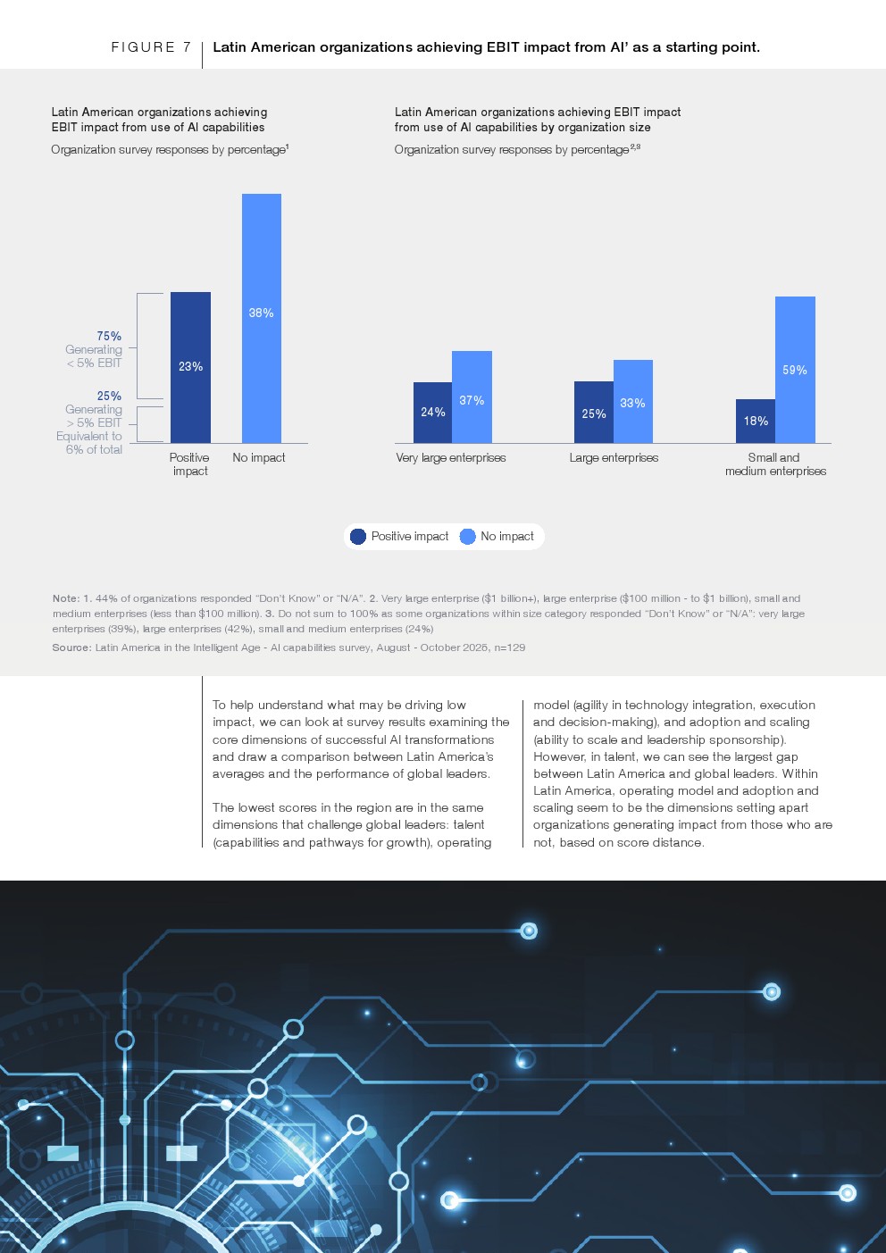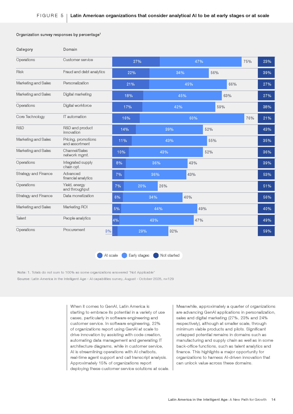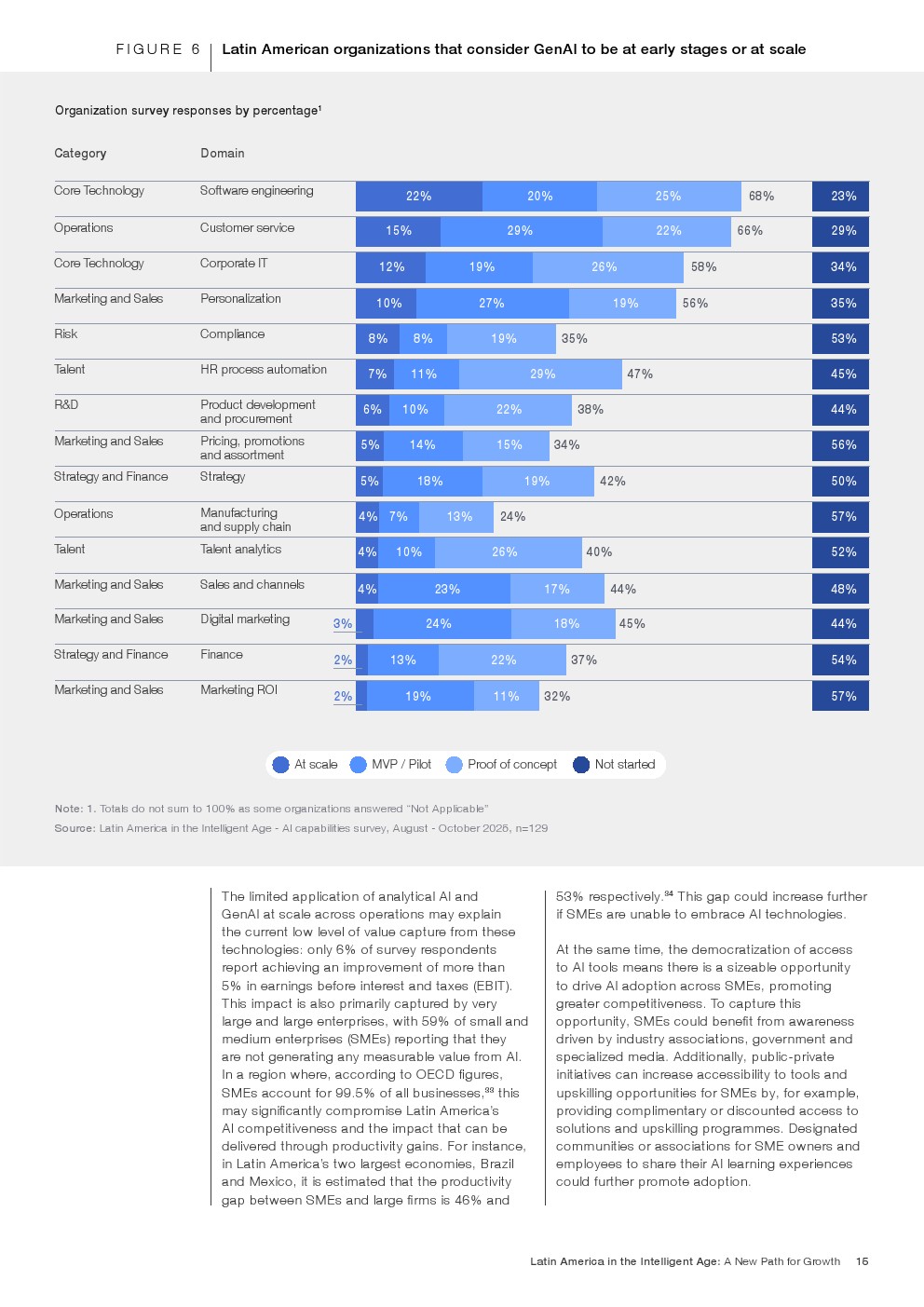人工智能的采用在不同行业和国家正在增加,特别是在客户服务和软件工程等行业。然而,实际的经济影响和价值获取仍然有限。根据我们为本报告进行的区域调查,只有23%的拉丁美洲组织从人工智能使用中产生了任何经济价值,整个地区只有6%的组织报告称从人工智能中创造了显著价值。