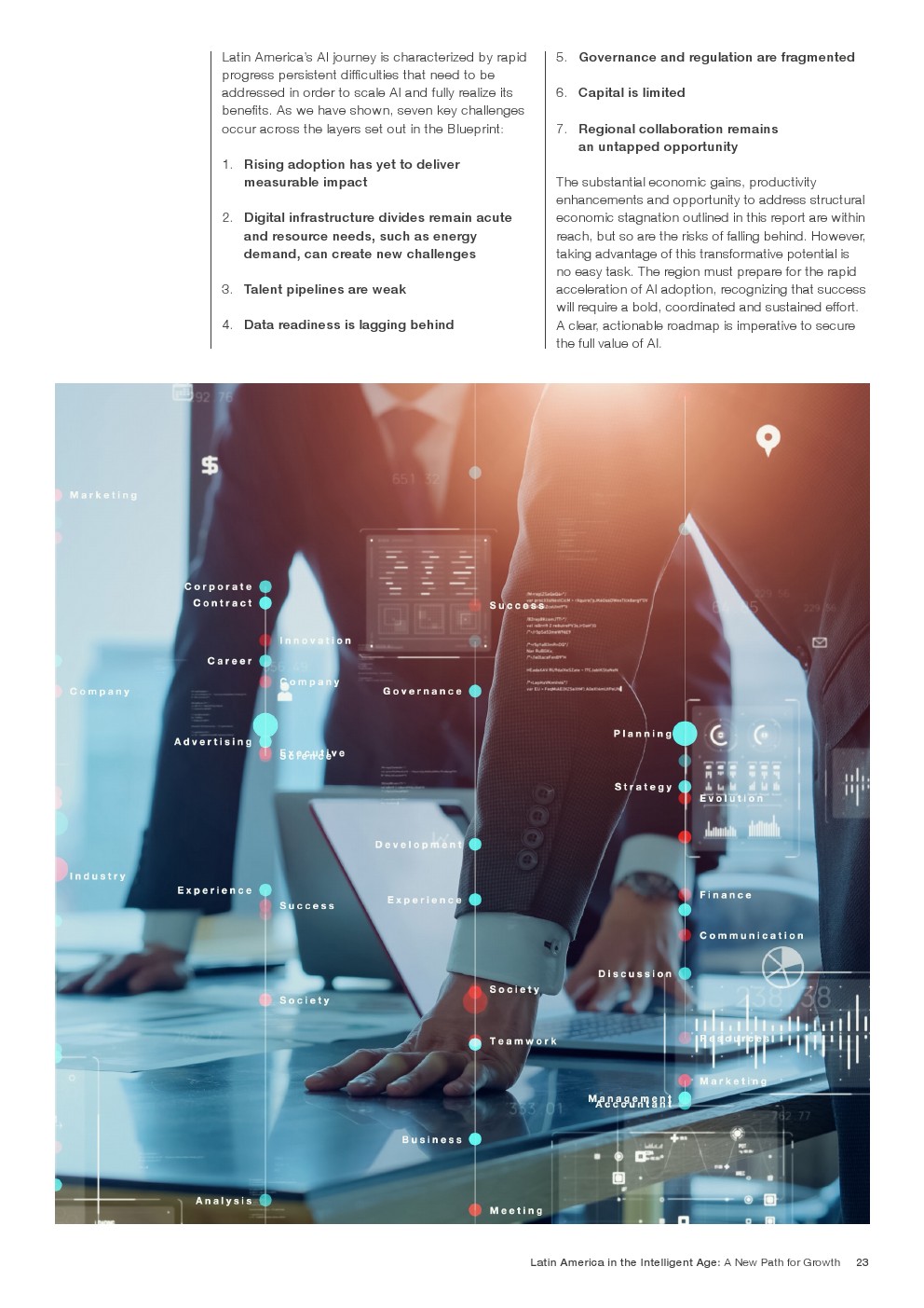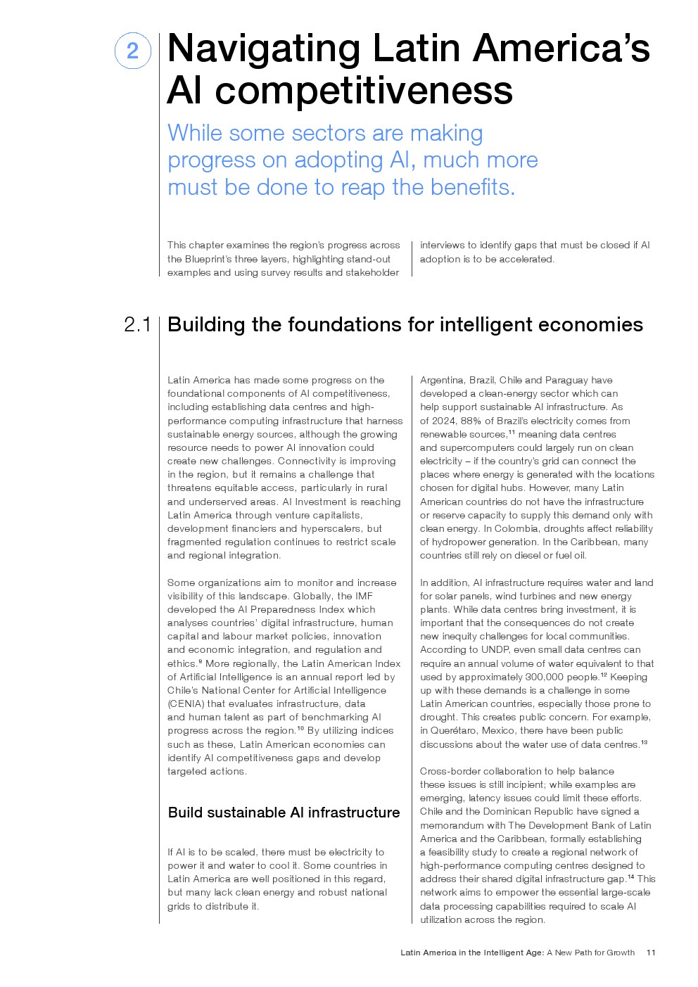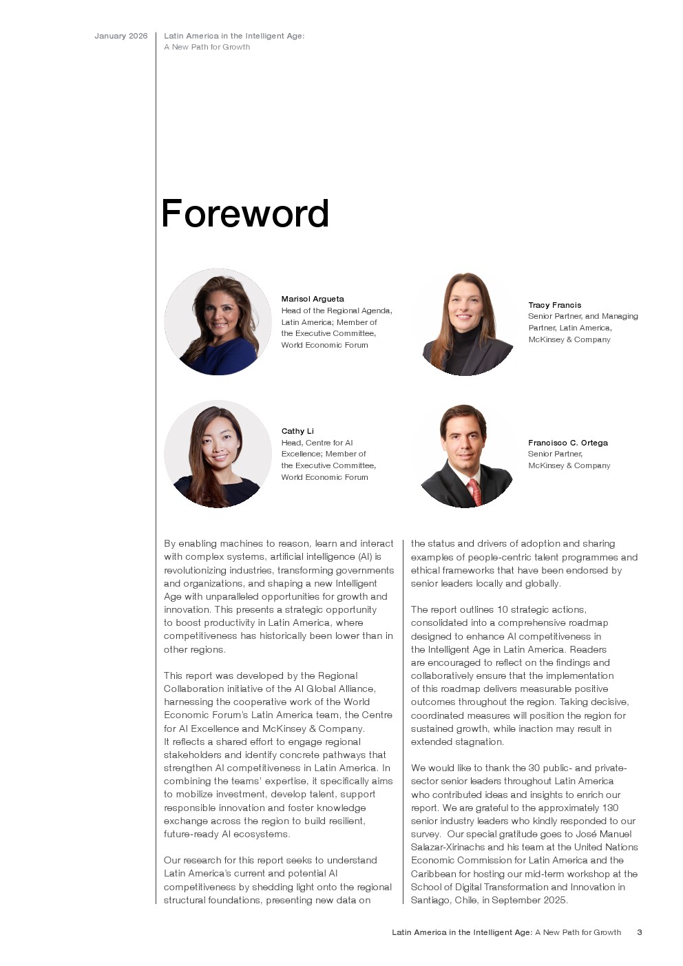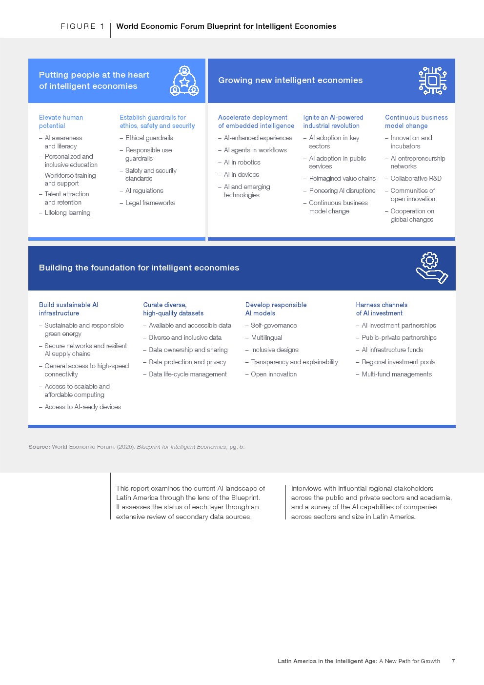 本报告通过宏观经济数据、公司层面的分析以及与一个高级别多利益相关者群体的定性磋商,评估了拉丁美洲的人工智能准备度和采用水平。该框架建立在世界经济论坛“智能经济蓝图”中提出的层次之上。