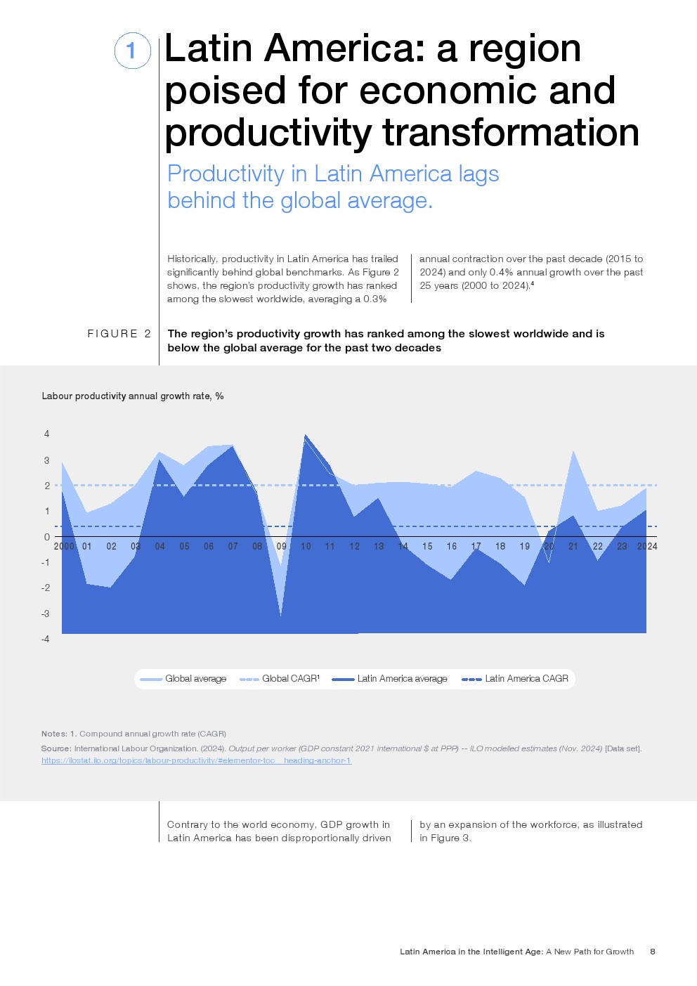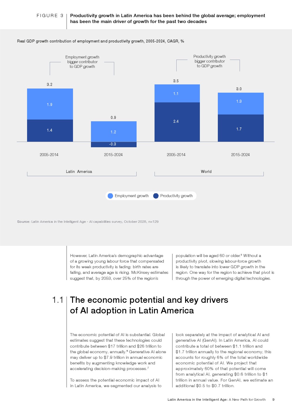 人工智能对拉丁美洲具有相当大的潜力,该地区的经济增长历来由劳动力扩张而非生产力提升所推动。在整个地区推进人工智能的应用,可能使生产力每年提高1.9%至2.3%,并创造估计每年1.1万亿至1.7万亿美元的额外经济价值。