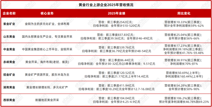 金价暴涨,但黄金产业链上下游却是冰火两重天,即“上游热”和“下游冷”。7家黄金行业上游企业的财报数据,3家营收涨幅超过50%,几乎所有的净利润增速超过50%。龙头企业紫金矿业,2025年前三季度营收2542亿元,而全年归母净利润预计510亿-520亿元,赚得可谓盆满钵满。
