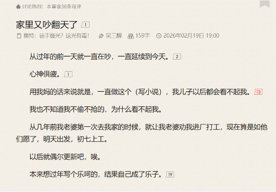 这意味着,这位曾写出万订作品的作者,今天已走进工厂。他坦言,自己写的是小众同人,收入虽不及头部作者,但“比进厂打工肯定强不少”。真正压倒他的,是农村“乱七八糟的闲话太多”,搞得家里鸡犬不宁。