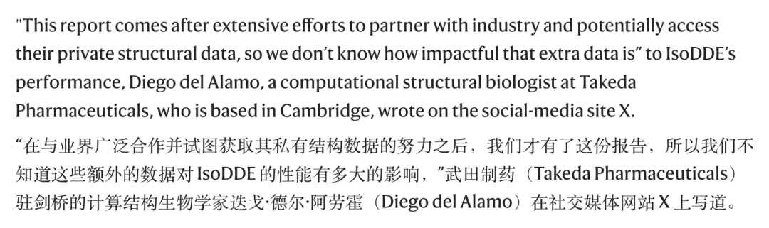 武田制药的计算结构生物学家 Diego del Alamo 指出了另一个微妙之处:Isomorphic Labs 此前投入大量精力与药企合作,可能获得了大量私有实验数据。
