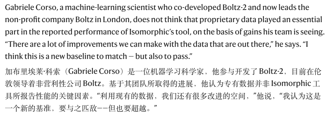 Boltz-2 的联合开发者、非营利公司 Boltz 的创始人 Gabriele Corso 态度很明确:他不认为私有数据是关键因素,因为公开数据中仍然有大量改进空间。