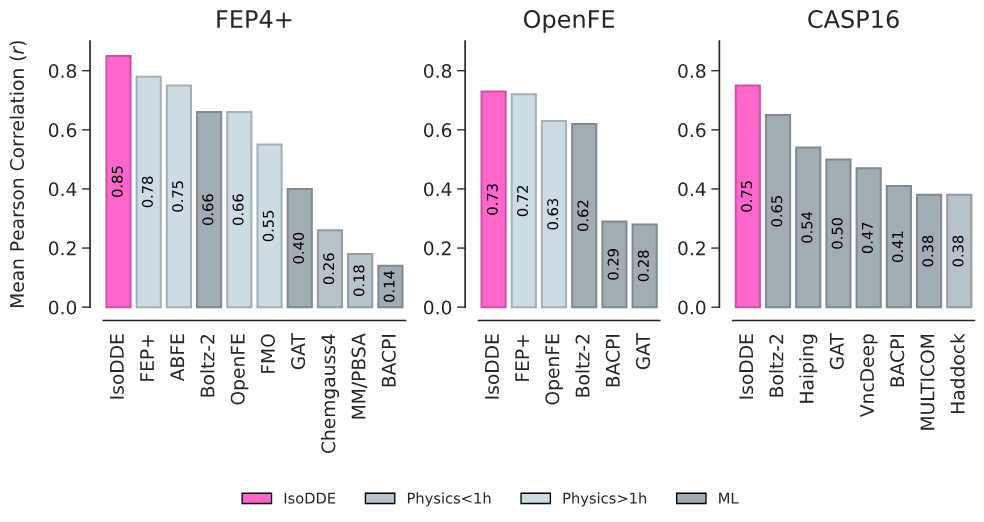 IsoDDE 在多个公开测试中不仅全面超过所有 AI 方法,甚至超过了 FEP,而且它根本不需要任何实验数据做起点。