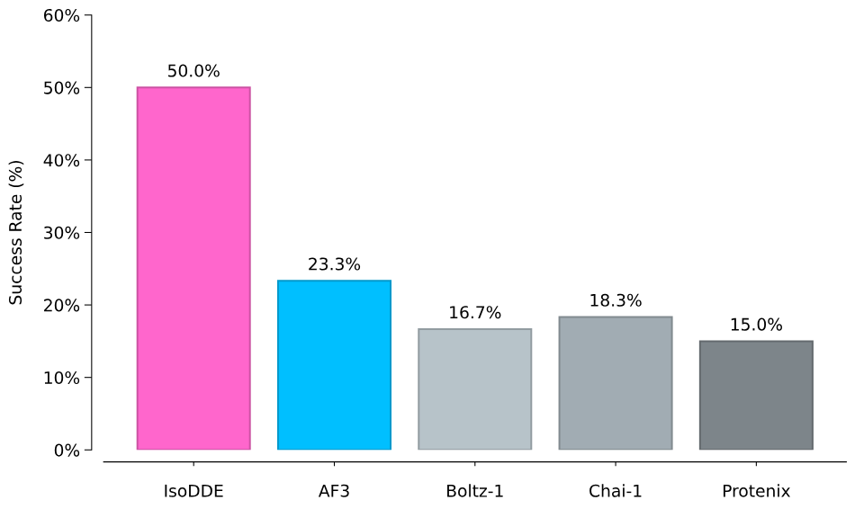 在预测抗体如何识别靶标这件事上,IsoDDE 的高精度预测成功率是 AlphaFold 3 的 2.3 倍,是另一个主流开源模型 Boltz-2 的近 20 倍。