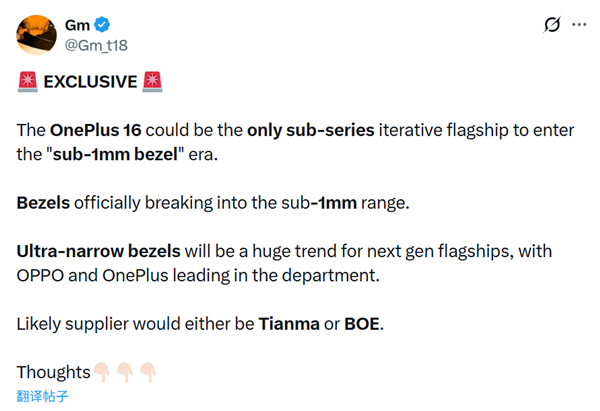 在供应链方面,一加16的这块屏幕将由天马或京东方提供。目前天马已经率先拿出了边框仅为0.8mm的样屏,并且同样坚持了极具视觉冲击力的四等边设计。