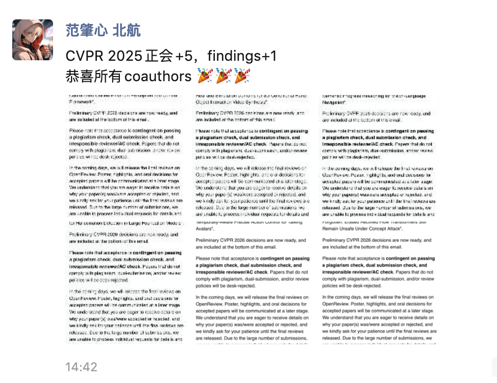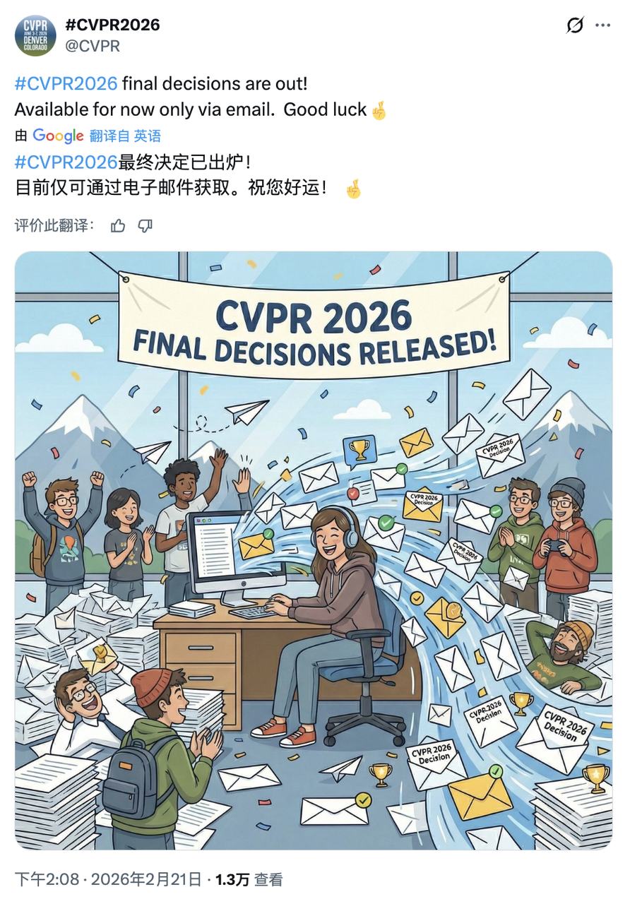 就在 2 月 21 日下午,CVPR 2026 向全球投稿者发出了录用通知邮件。