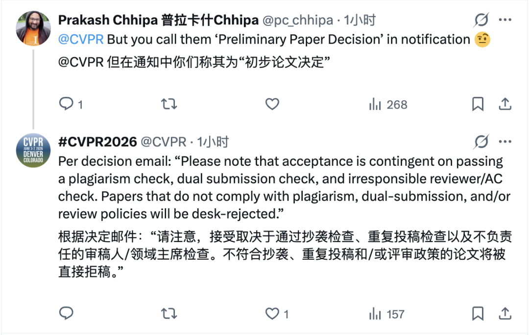 此外,官方在邮件中用「Preliminary Paper Decision」(初步论文决定)来描述这次通知,也被眼尖的研究者捕捉到并在 X 上提出质疑。