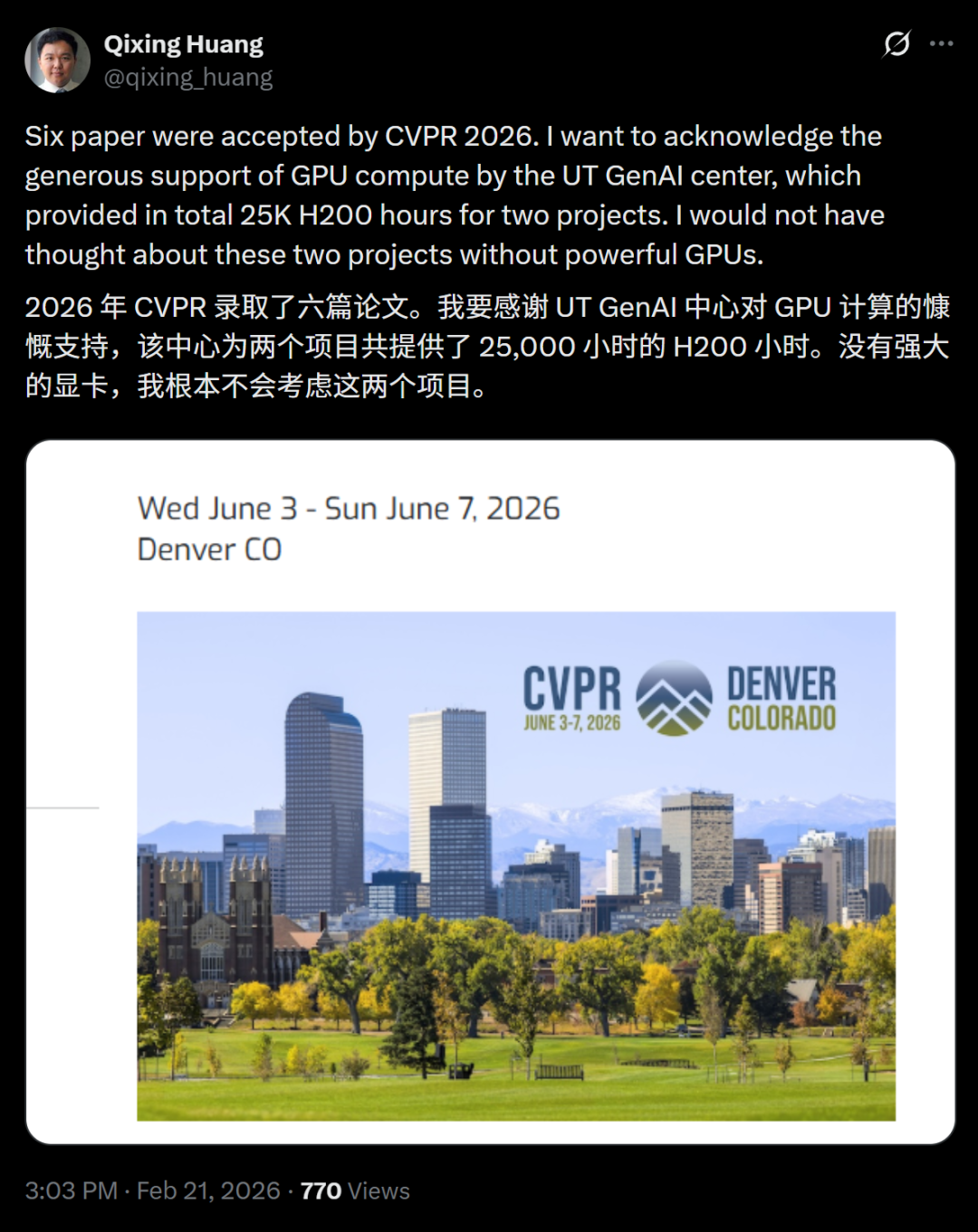 他晒出喜讯,同时感谢了 UT GenAI 中心在 GPU 计算资源方面的慷慨支持,他们为两个项目总计提供了 25,000 小时的 H200 算力。