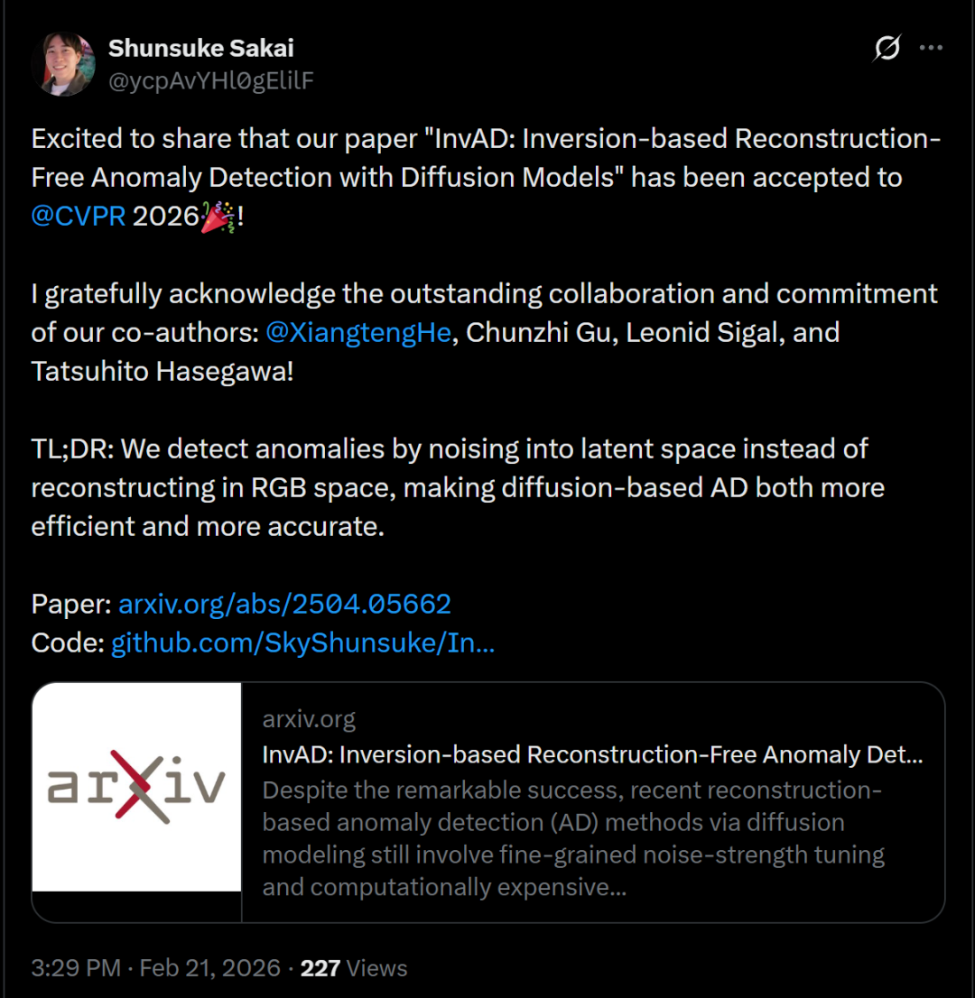 这篇论文提出了一种新的基于扩散模型的异常检测方法 ——InvAD,核心思想是:不再通过「重建图像再对比」来检测异常,而是直接在潜空间中加噪并做概率偏离判断。