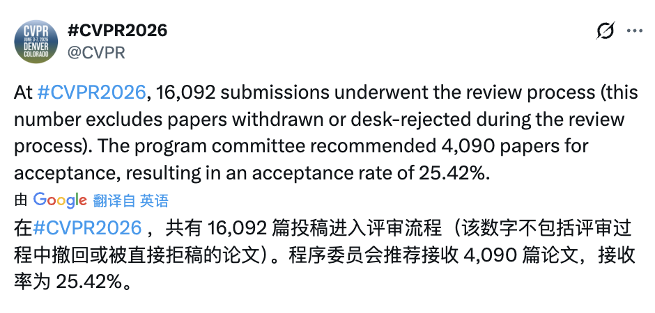 未经允许不得转载:紫竹林-程序员中文网 » 计算机视觉 CVPR 2026 放榜:超 16000 篇投稿,3/4 被拒