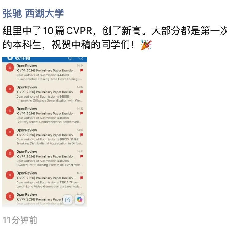 西湖大学张弛老师的组里,总共中了 10 篇 CVPR,而且大部分都是第一次投稿参会的本科生。