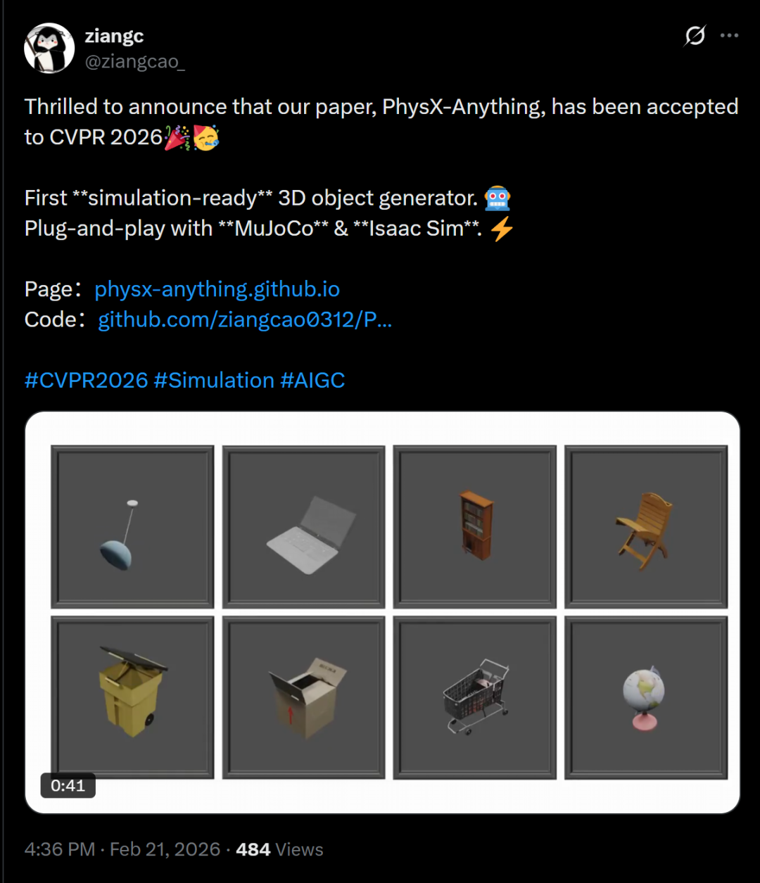 南洋理工大学博士生曹子昂分享称,自己团队的论文 PhysX-Anything 已被顺利接受。