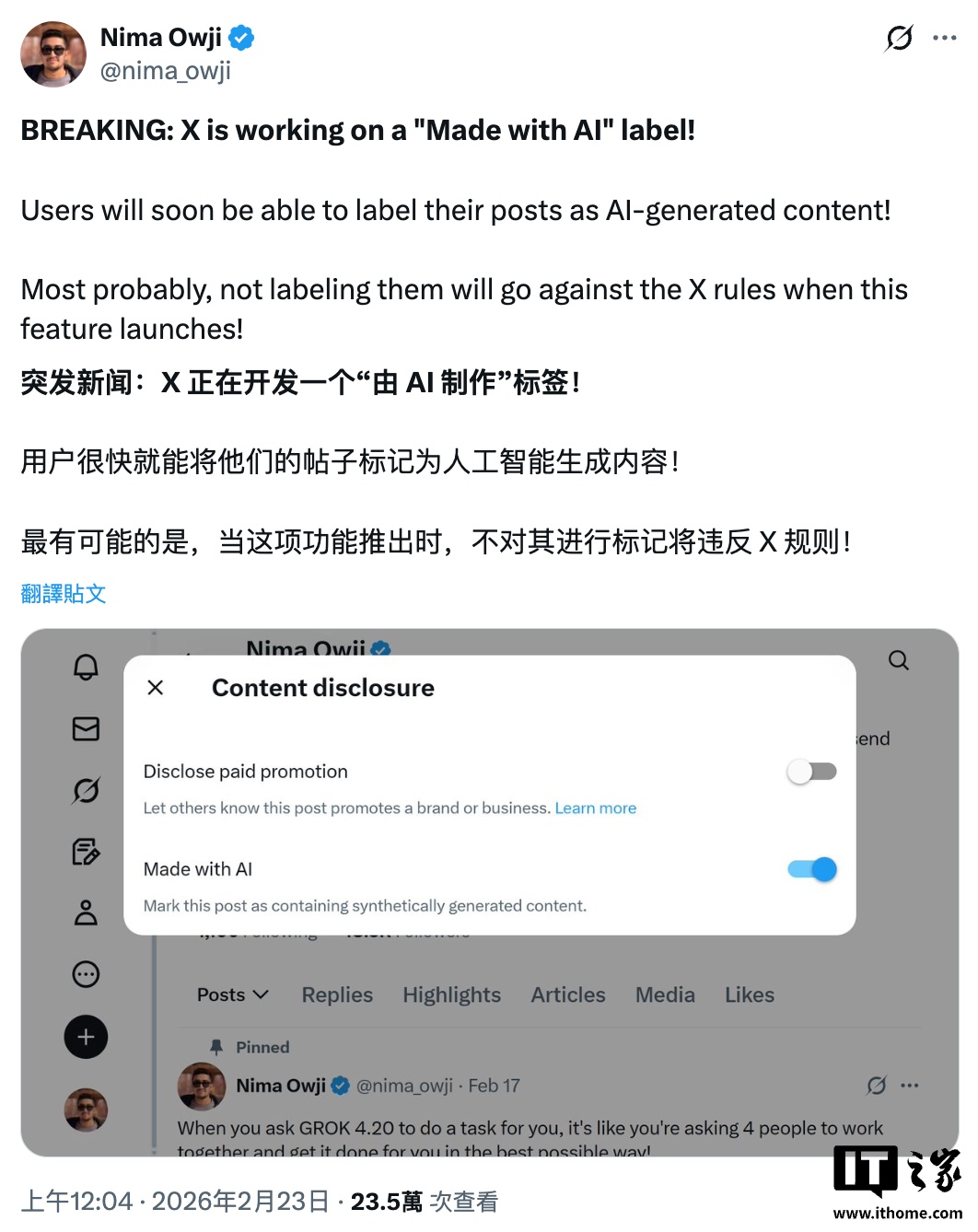 IT之家 2 月 23 日消息,独立应用程序研究员 Nima Owji 今天发文称,X 平台正在悄悄测试“AI 生成”(Made with AI)内容标签。