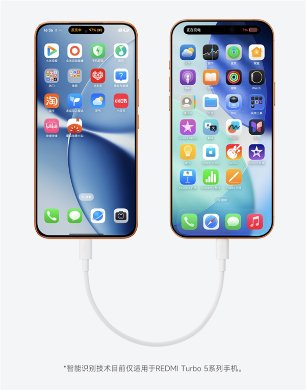 这根线最大的特色是支持智能反充功能,搭配REDMI Turbo 5系列,内置智能芯片可自动识别设备类型,支持具备反向充电功能的手机为其他设备供电,连接电源时则可正常为各类设备快充。