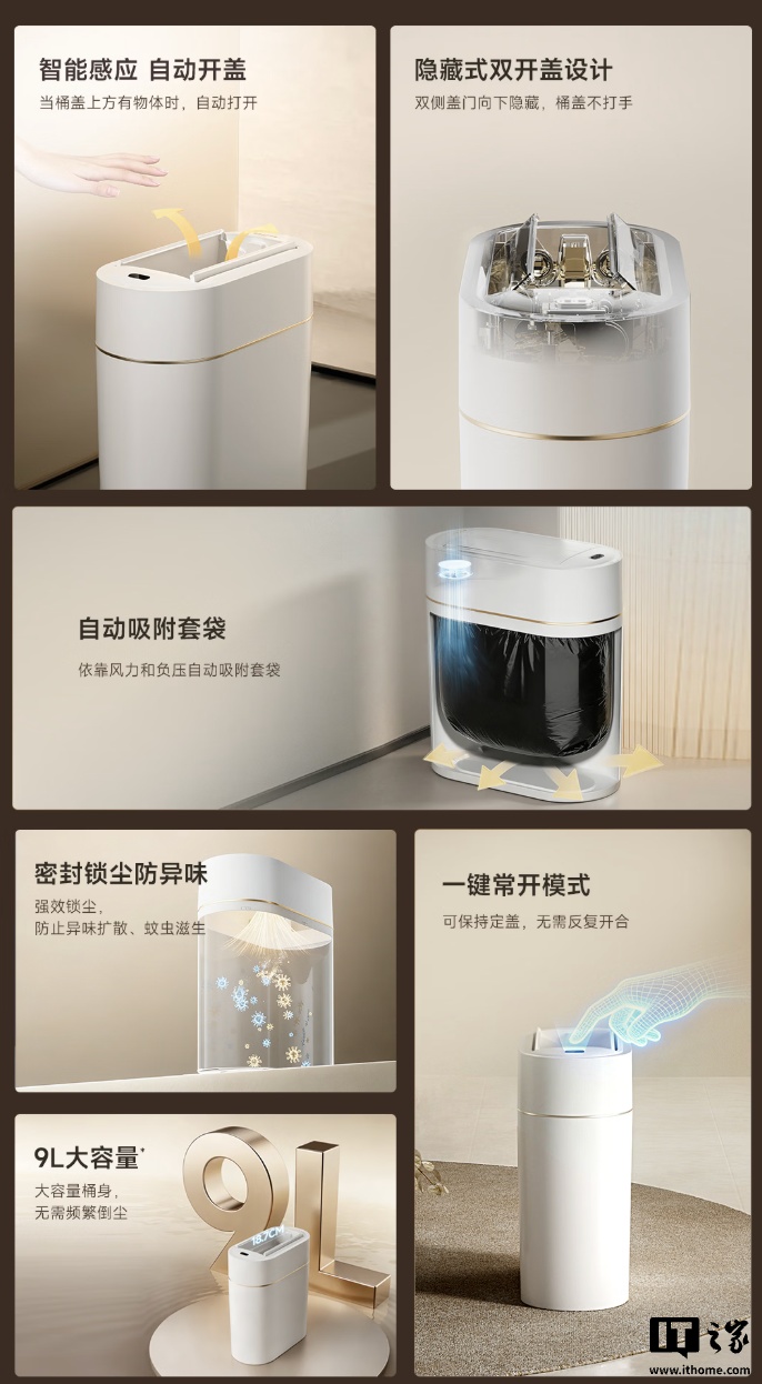 据介绍,该产品使用 5 号电池供电,采用隐藏式双开盖设计,带有智能感应传感器,可实现自动开盖。垃圾桶提供 9L 容量,可容纳较多垃圾,用户可一键控制垃圾桶智能吸附套袋。