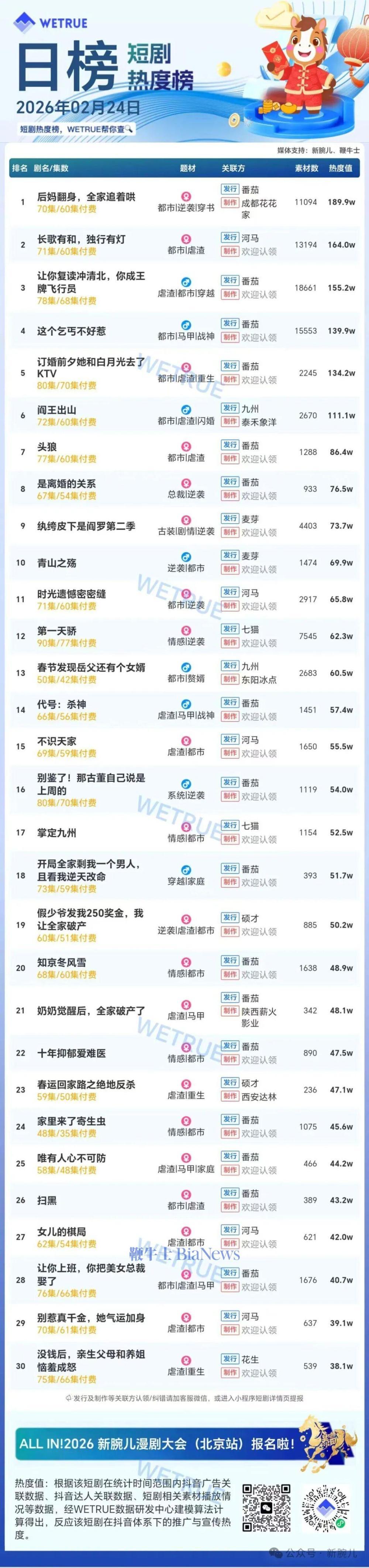 今天发布的是昨天(2月24日)漫剧及短剧付费大盘日榜。