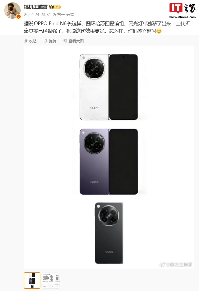 IT之家 2 月 25 日消息,博主 @搞机王腾霄 昨晚分享了 OPPO Find N6 的外观图。画面显示,新机外观与前代相近,后置圆环哈苏四摄镜组,闪光灯单独移至机身左上角。