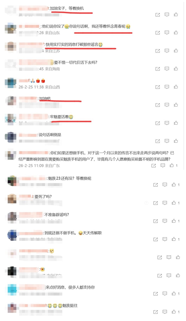 截至发稿,星纪魅族方面尚未对此作出回应。在魅族科技的微博账号评论区,气氛显得格外悲壮。依然有很多老用户在坚持为它加油,他们留言询问魅族23是否还有机会见一面,字里行间流露出对这个老牌国产手机品牌的不舍。