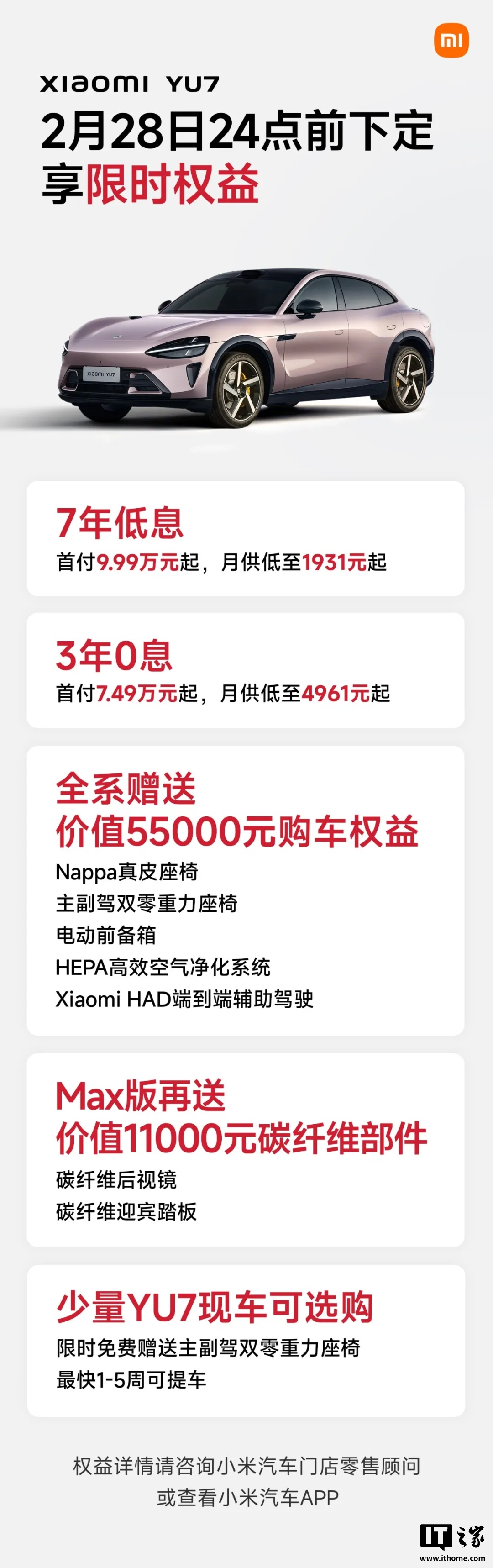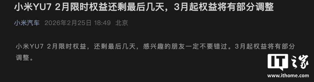 IT之家 2 月 25 日消息,据小米汽车公众号,小米汽车透露 YU7 限时购车权益将于下月(3 月)起有部分调整。