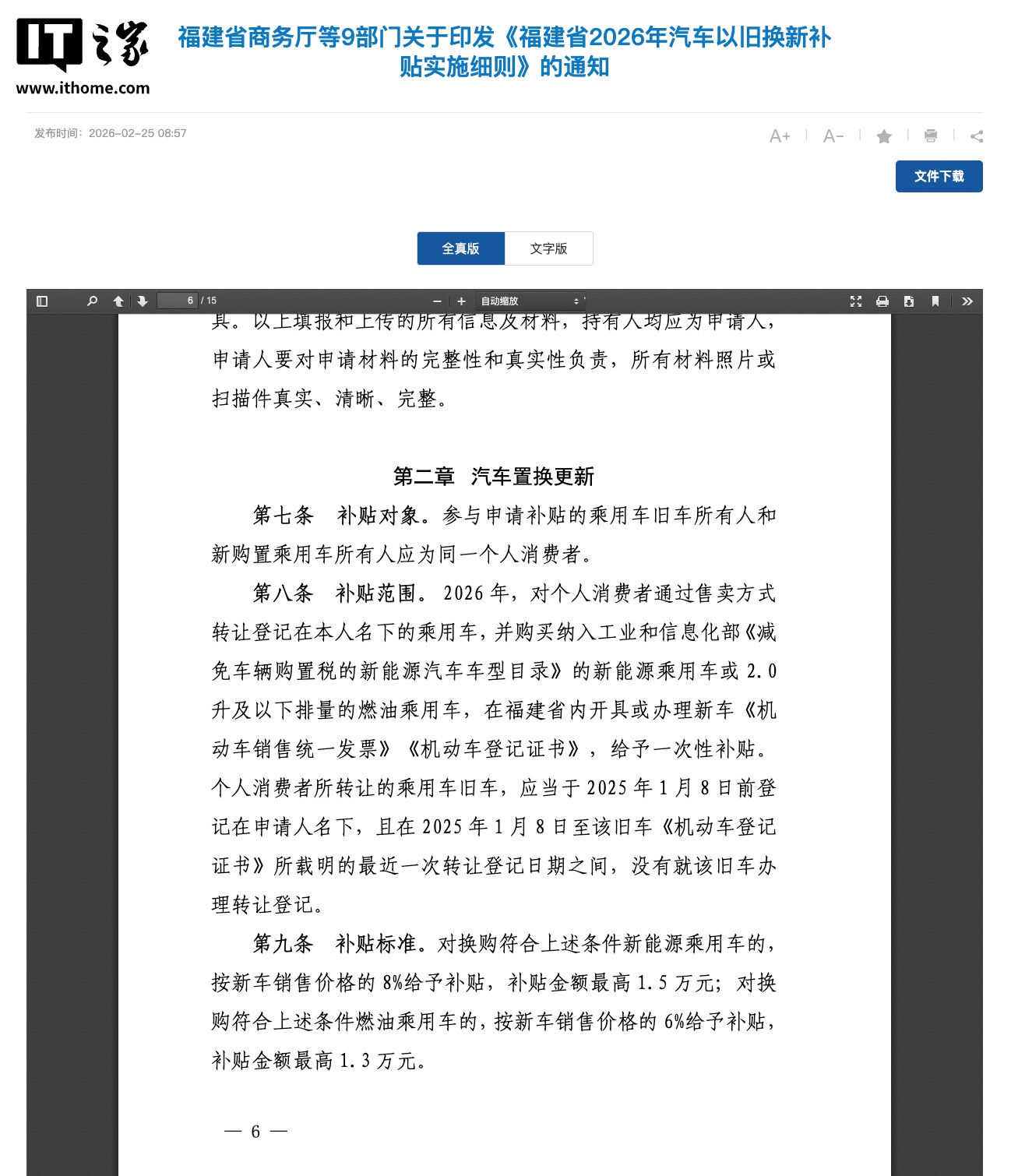 IT之家 2 月 25 日消息,福建省商务厅等 9 部门于今天印发《福建省 2026 年汽车以旧换新实施细则》,主要介绍了今年福建省汽车以旧换新活动方案。