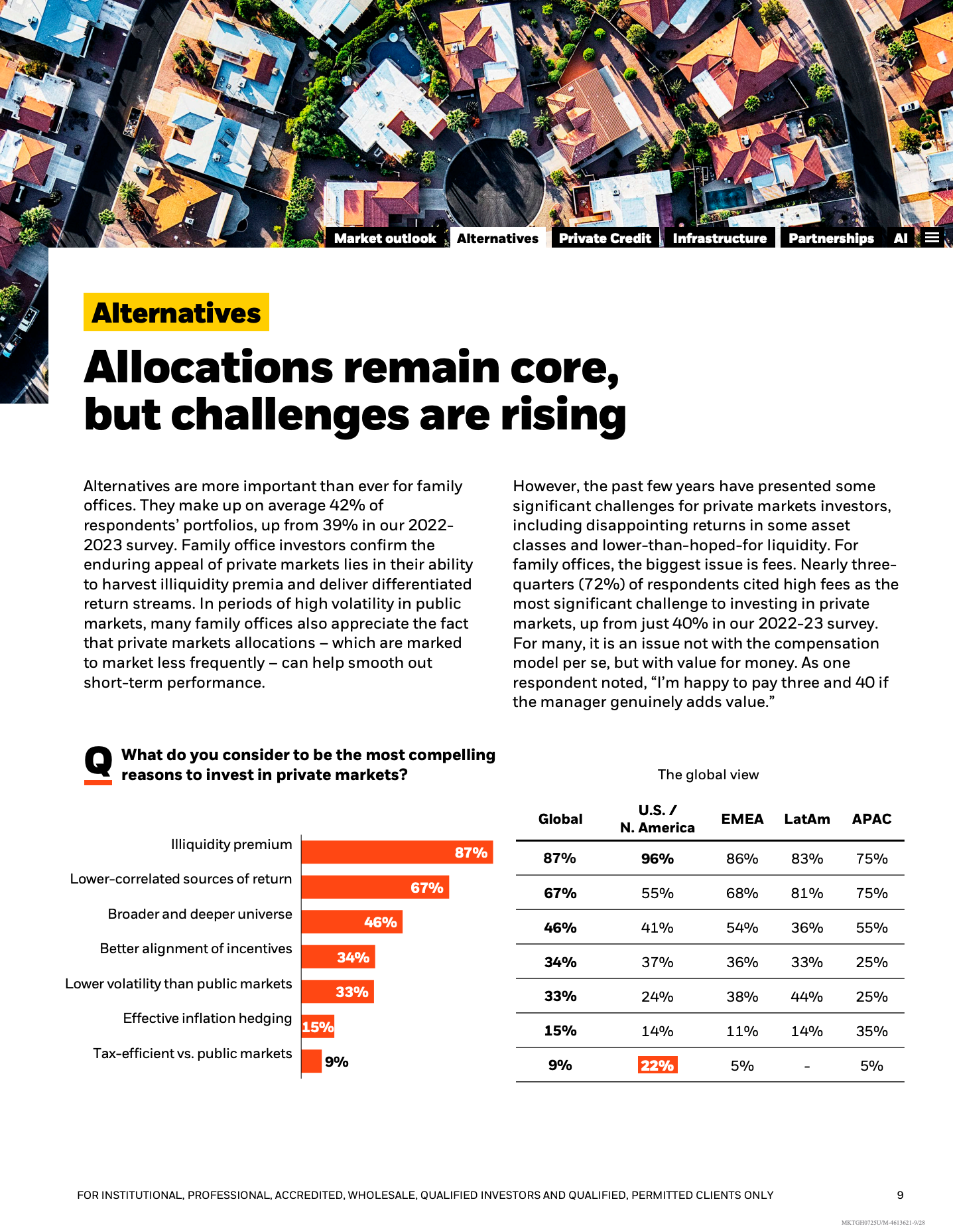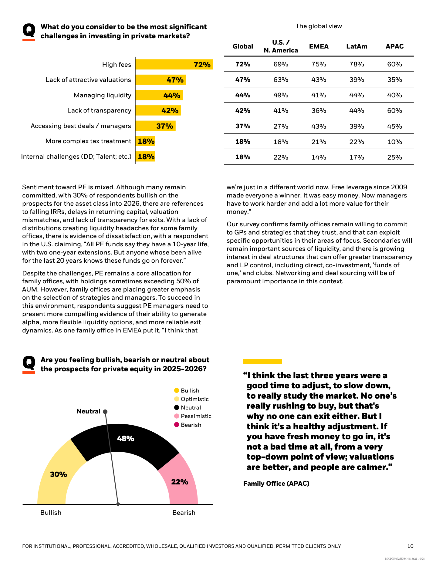 在资产配置层面,另类资产已占家族办公室整体投资组合的42%,较上一轮调查提高3个百分点。私募市场的吸引力主要来自流动性溢价和低相关性收益,但72%的受访者明确指出高费用是最大痛点,较2022至2023年的40%大幅上升,反映家族办公室正从“接受高费率”转向“强调性价比”。