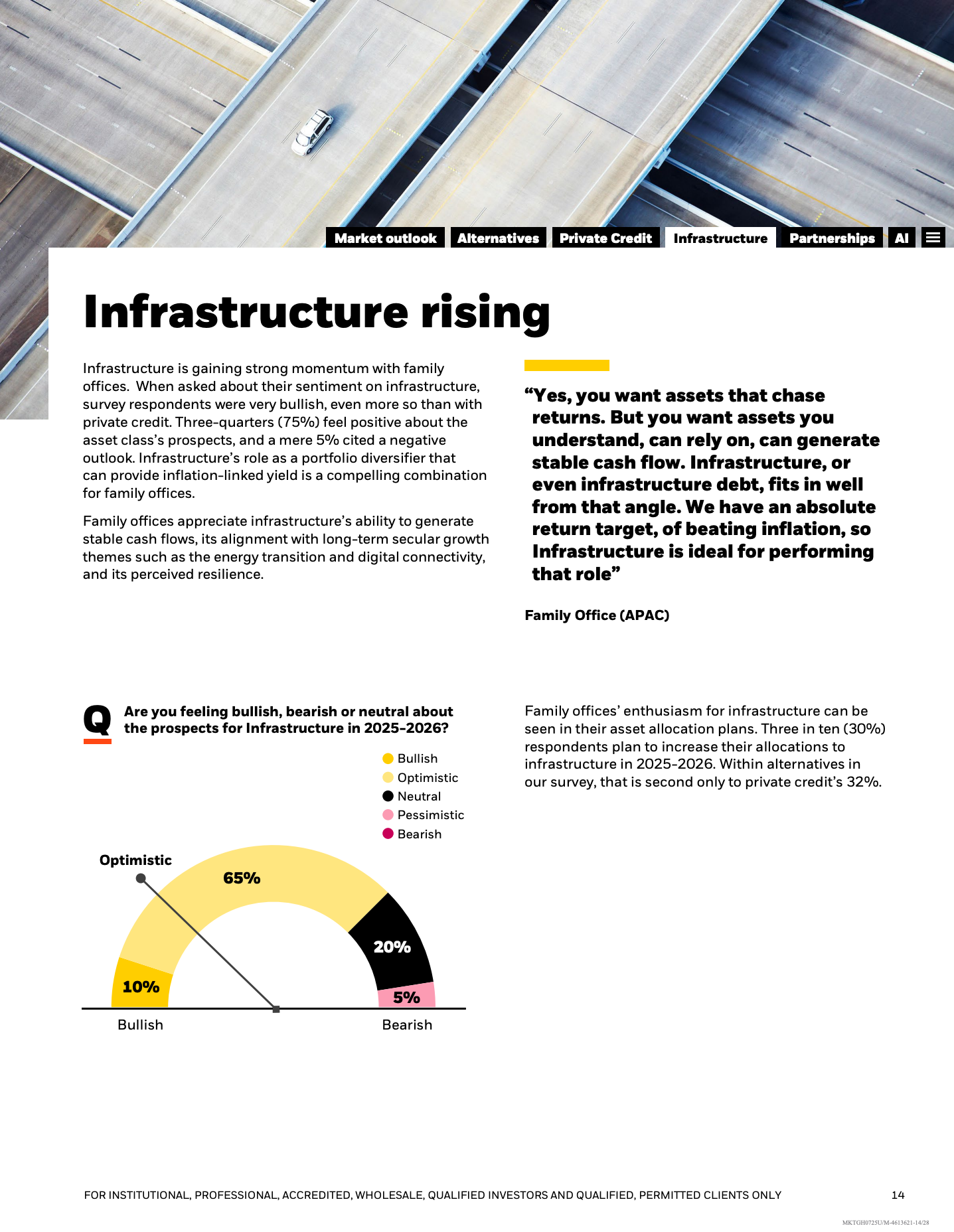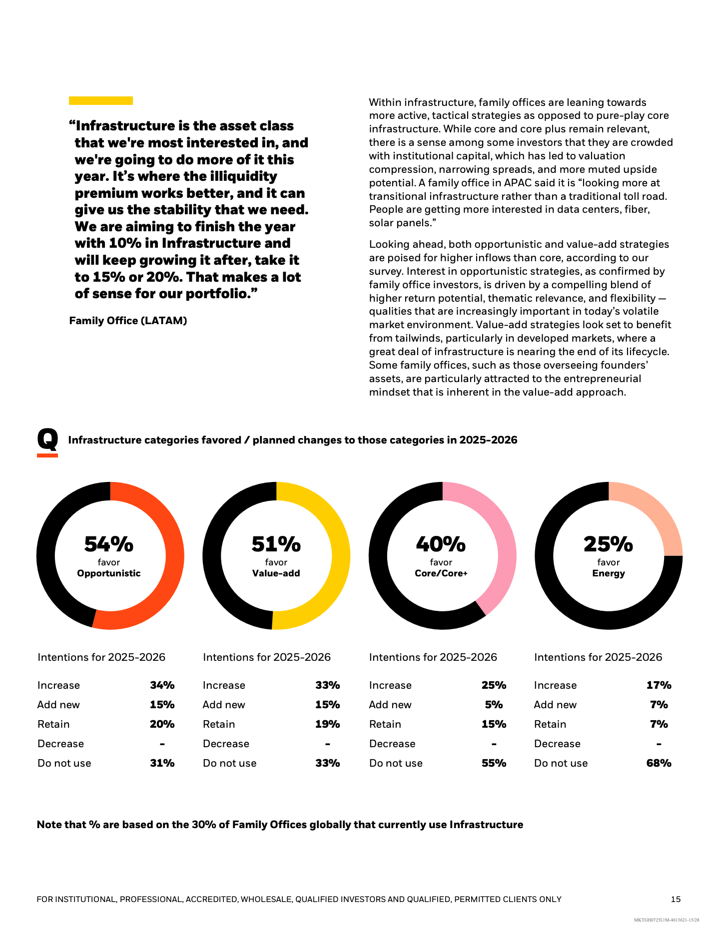 基础设施投资同样快速升温。75%的家族办公室对该资产类别持乐观态度,仅5%看空,30%计划未来两年提高配置比例。与传统核心型基础设施相比,价值增值型与机会型策略更受欢迎,背后逻辑在于能源转型、数字基础设施和老化资产更新带来的长期现金流与抗通胀属性。
