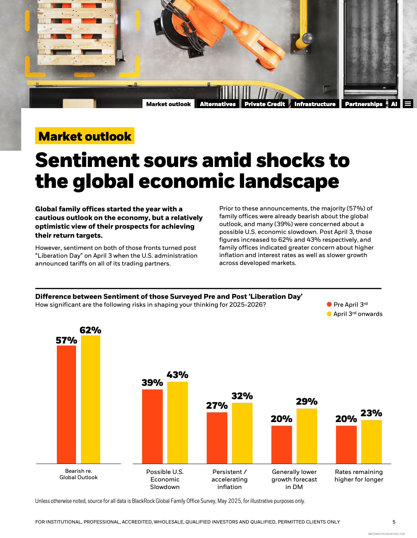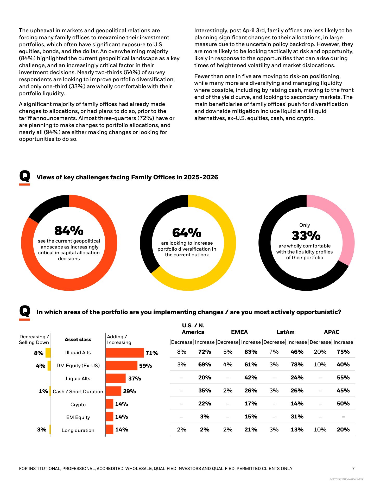 从宏观环境看,84%的家族办公室将地缘政治视为2025至2026年的首要挑战,60%的受访者对全球宏观前景持悲观态度。美国“解放日”关税政策出台后,对全球前景持悲观态度的比例由57%升至62%,对实现目标收益有信心的比例则从64%下降至51%,显示政策冲击对风险预期具有显著放大效应。