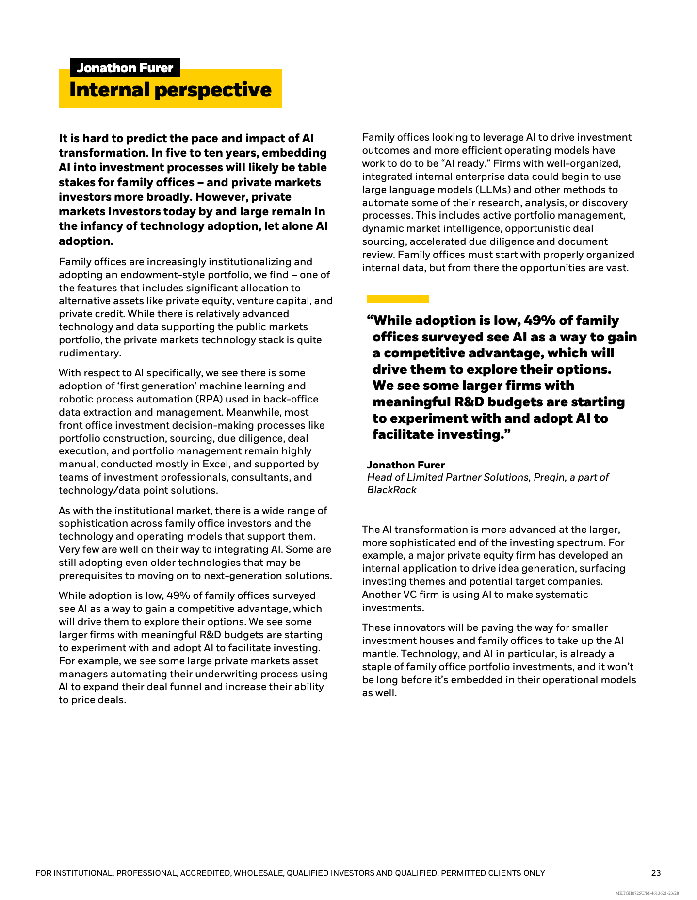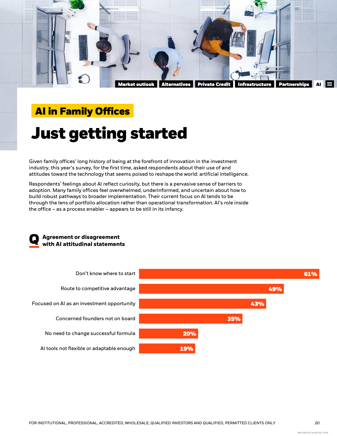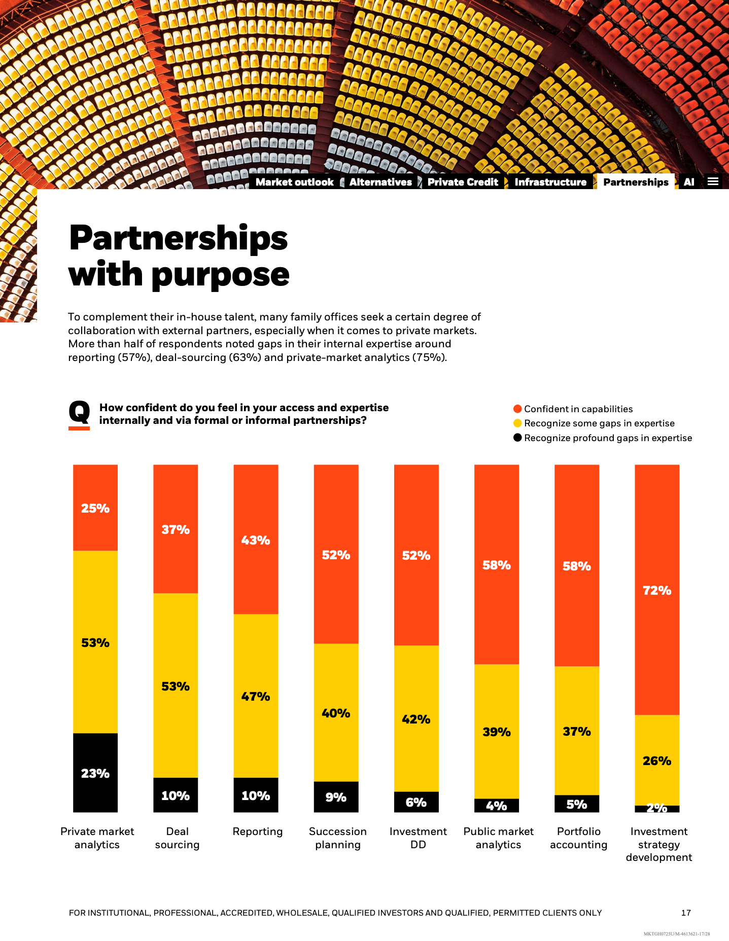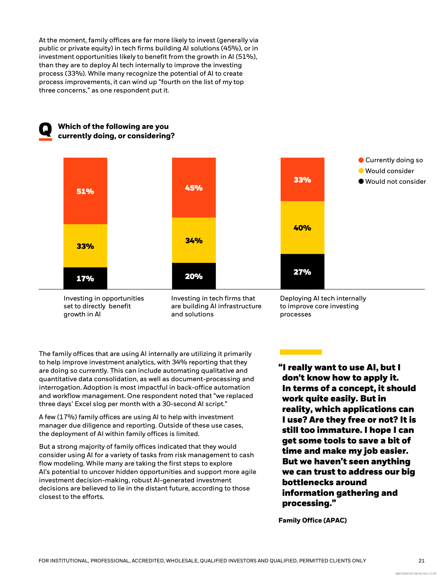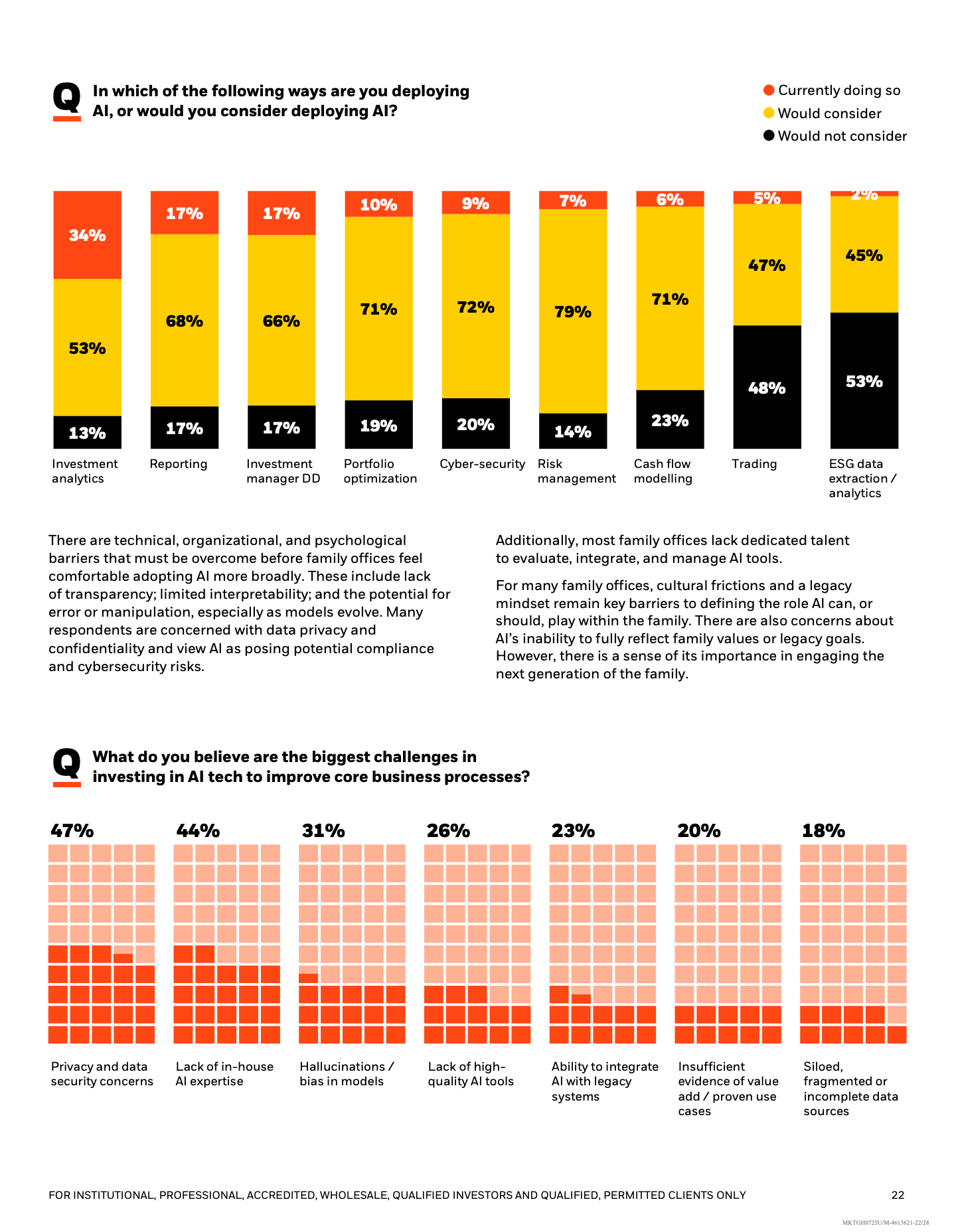 人工智能被视为潜在变革力量,但应用仍处早期阶段。61%的家族办公室表示“不知从何开始”,仅33%已在内部部署AI工具,主要集中于投资分析和后台自动化。相较之下,51%更倾向投资于受益于AI发展的企业,而非直接用于自身投资流程改造。