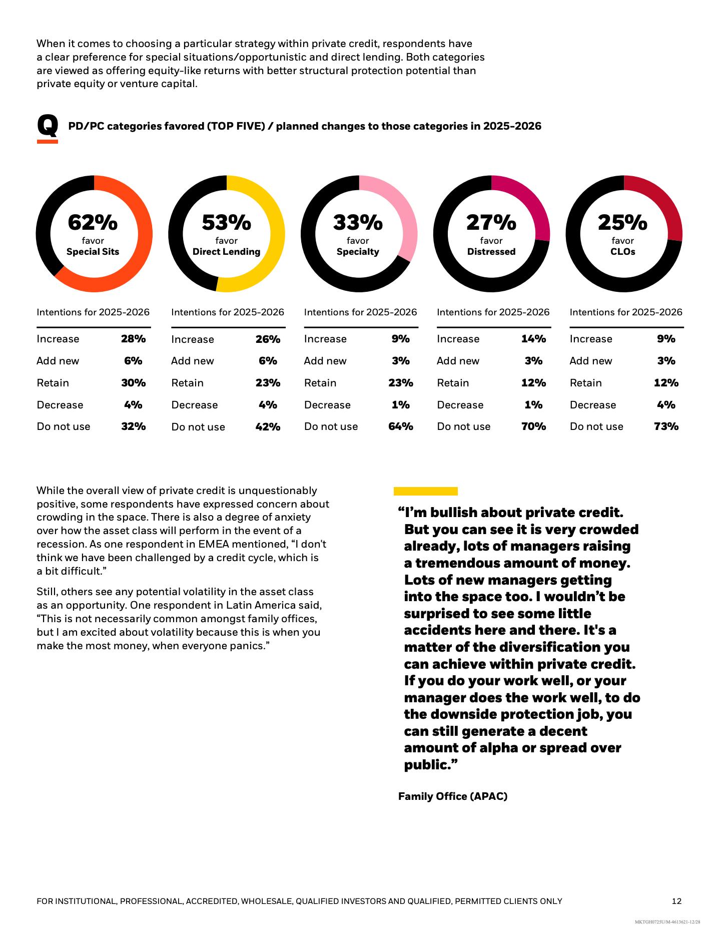 私募信贷成为配置结构中最显著的增量方向。51%的家族办公室对私募信贷前景持积极态度,仅21%偏负面,32%的受访者计划在2025至2026年继续加码,为所有另类资产中最高。在细分策略上,特殊情形投资和直接放贷最受青睐,被视为兼具类股权回报和更强结构性保护的工具。
