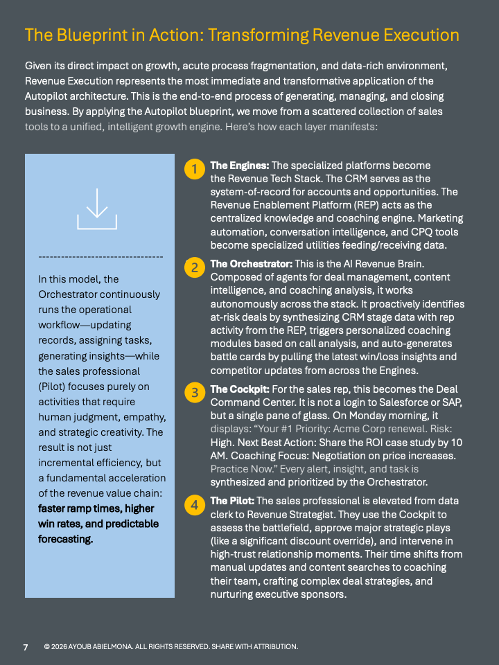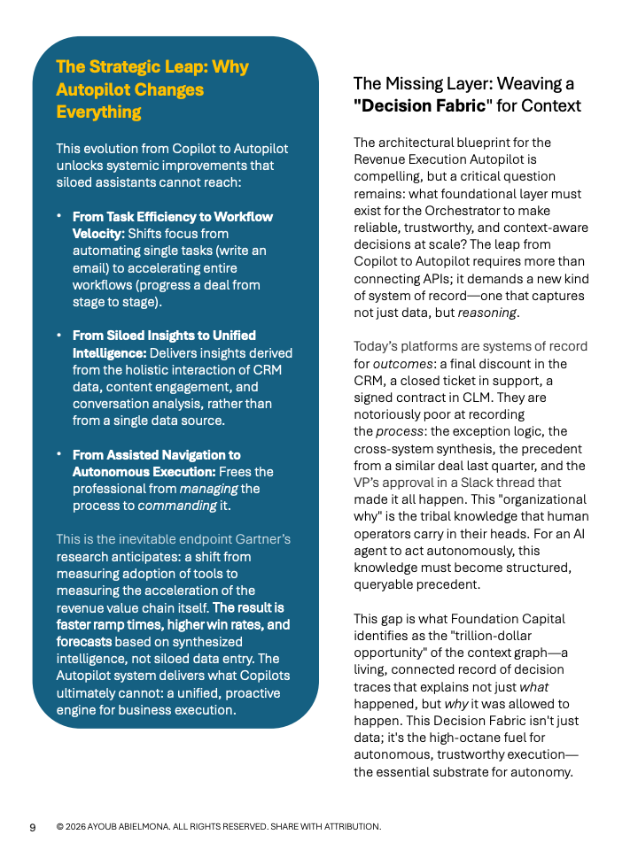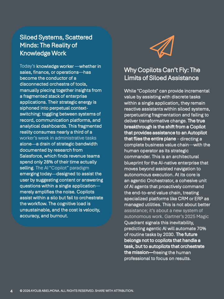 总体来看,数据所揭示的趋势十分明确。企业竞争正从工具堆叠转向执行层智能化,决策上下文正在成为新的关键生产要素。率先完成从Copilot向Autopilot转型的组织,将在成本结构、响应速度与长期规模优势上形成显著分化,并重塑未来十年的竞争格局。