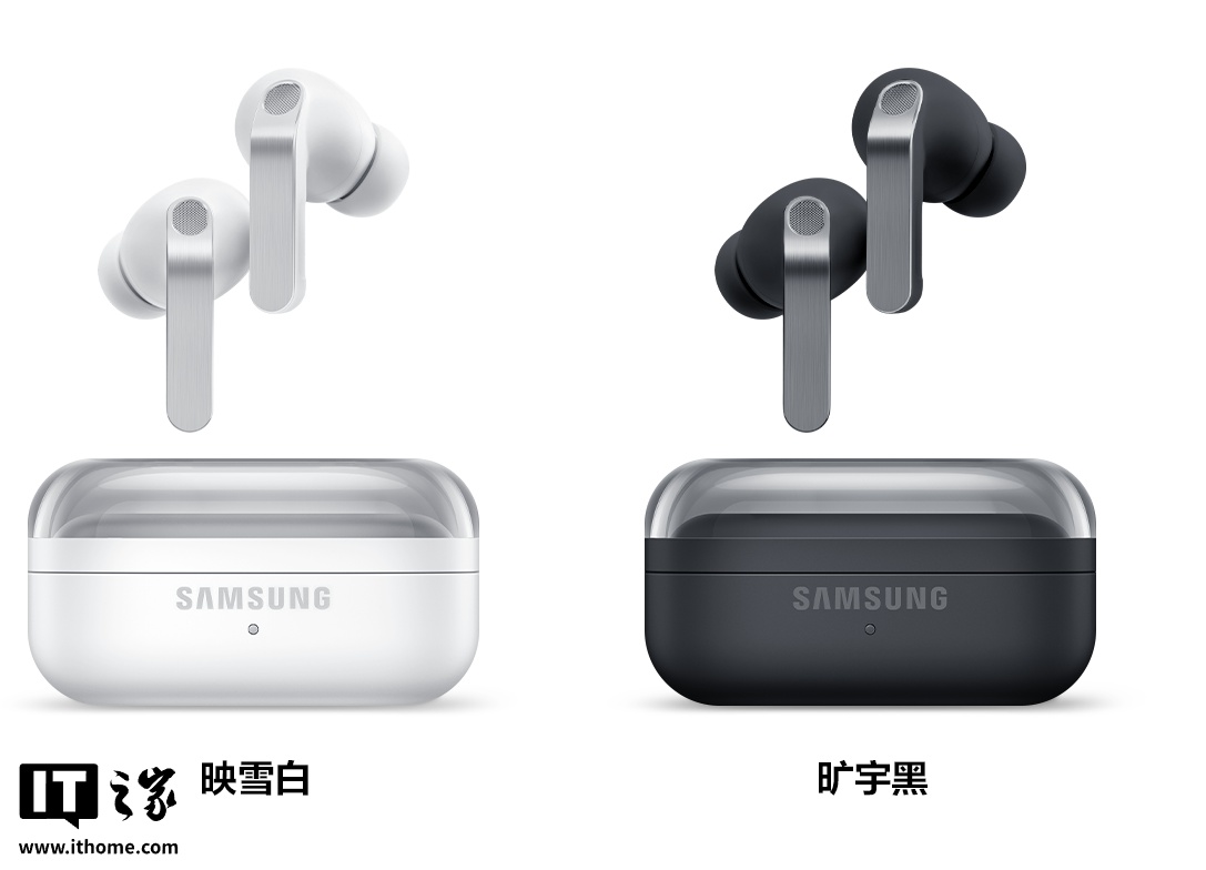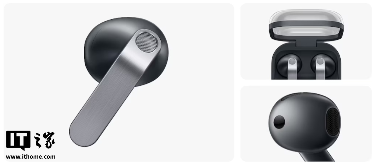 Galaxy Buds4 采用金属饰面外观,带柄半入耳式造型,可选黑白两款配色,Galaxy Buds4 Pro 还有官网专属金色外观。