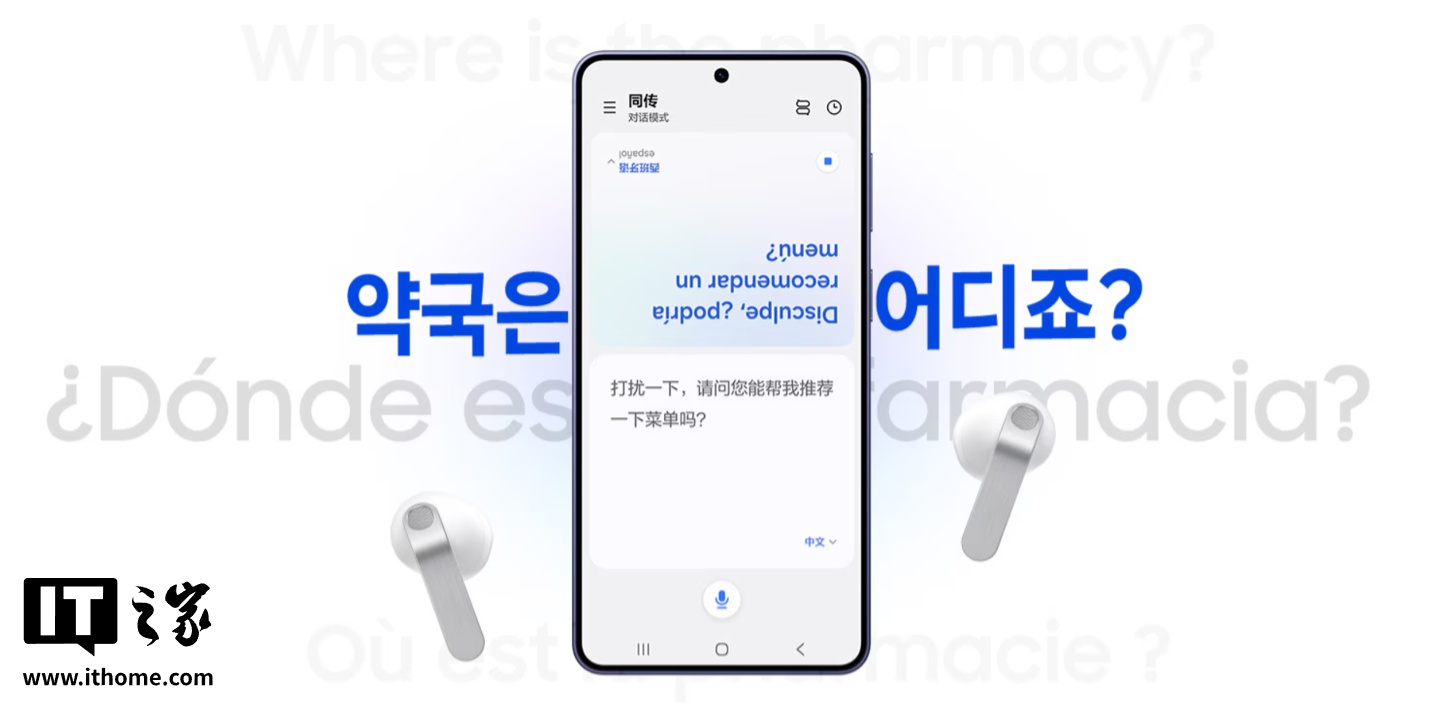 Galaxy Buds4 搭配手机可实现个性化 AI 同传功能。借助手机 Galaxy AI 同传的翻译能力,翻译结果可实时通过 Galaxy Buds4 聆听,也能在 Galaxy 智能手机上阅览。