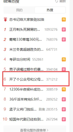 春节返工第一天的下午,#开了个公众号和父母魔法对轰# 冲上热搜前排。小王紧张得不得了,她对此感慨称“何德何能”——该话题热度一度超过同期《将门毒后》的相关词条。过了一小会,小王给蓝鲸记者发来消息:其实我很害怕被网暴。