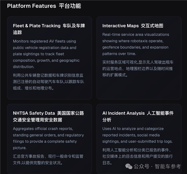 Robotaxi追踪器汇总了公开数据,包括车辆登记信息、车牌号、车辆所在地地图和交管局事故等。AI会利用这些数据,结合社交平台的目击信息分析,最终得出当地的车队情况。