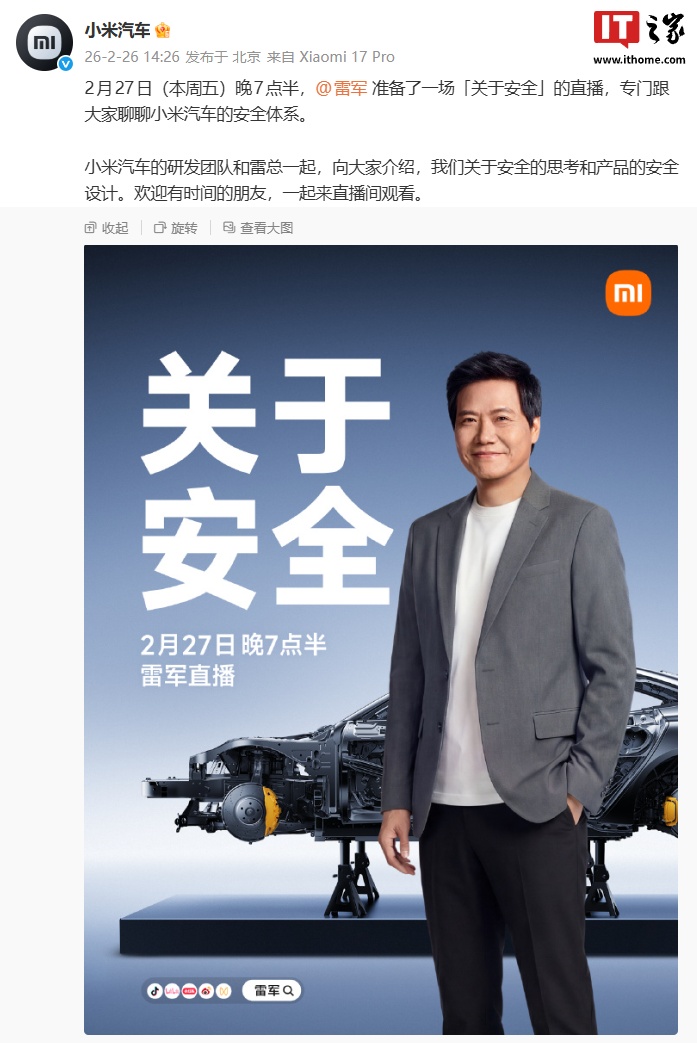 IT之家 2 月 26 日消息,小米汽车官方今日发布预告:2 月 27 日(本周五)晚 7 点半,小米创办人、董事长兼 CEO 雷军准备了一场「关于安全」的直播,专门跟大家聊聊小米汽车的安全体系