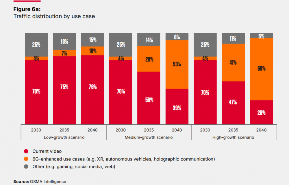 在GSMA假设的高增长情景下,到2040年,上行链路流量占比可能从当前的约15%提升至35%。6G增强型用例可能贡献近70% 的移动流量。该报告指出,中国作为6G领先市场,预计将更早显现这种流量的结构性变化。