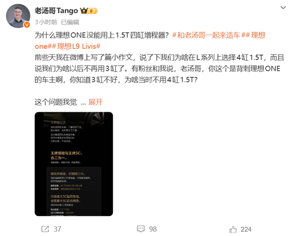 快科技2月27日消息,理想汽车产品线负责人“@ 老汤哥”,发文解释了为什么理想ONE没能用上1.5T的原因。