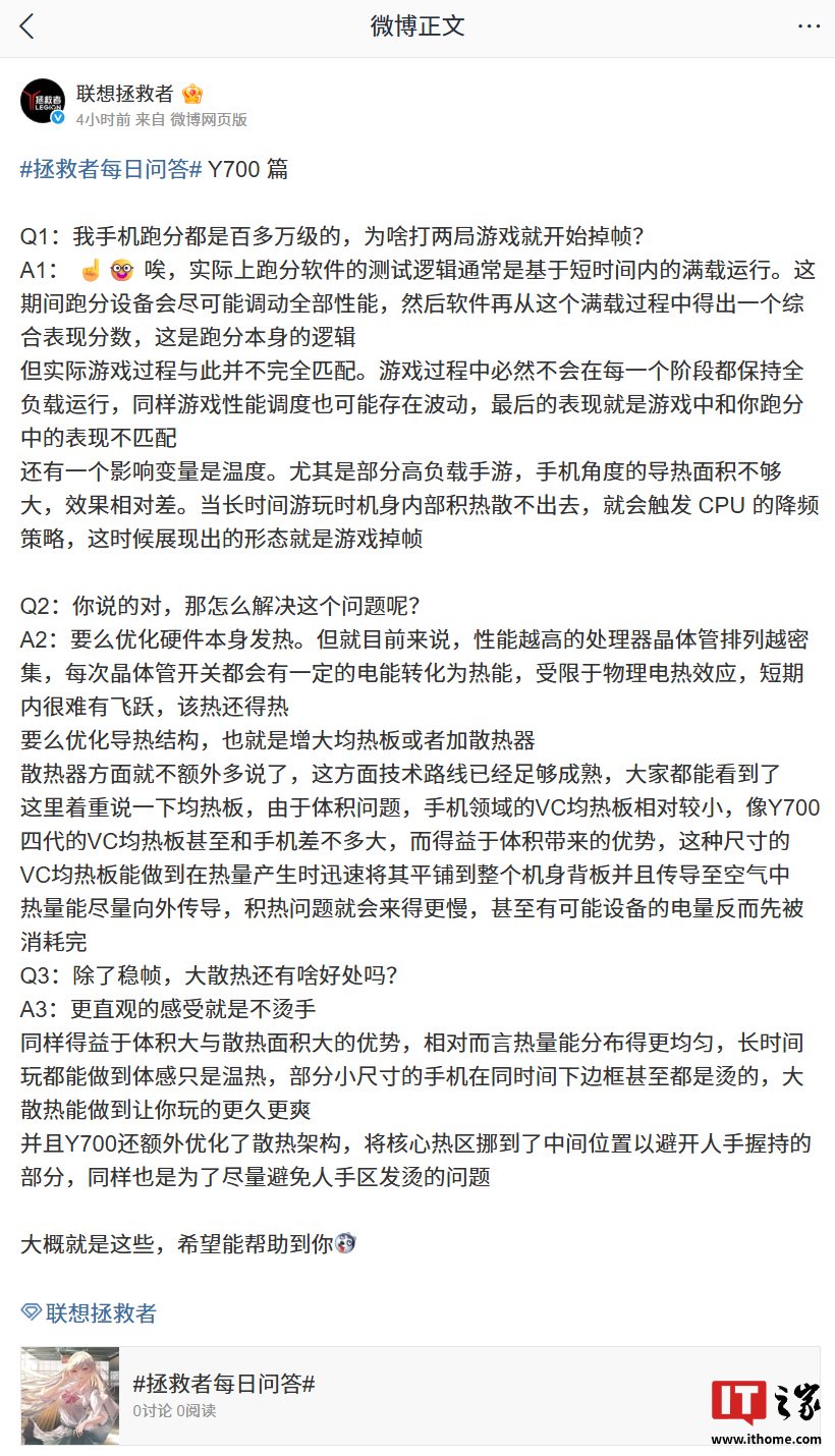 IT之家 2 月 26 日消息,联想拯救者官方今日发布了“拯救者每日问答 Y700 篇”,针对手机跑分超百万但打游戏缺掉帧、如何解决游戏掉帧问题、大散热的好处等问题。