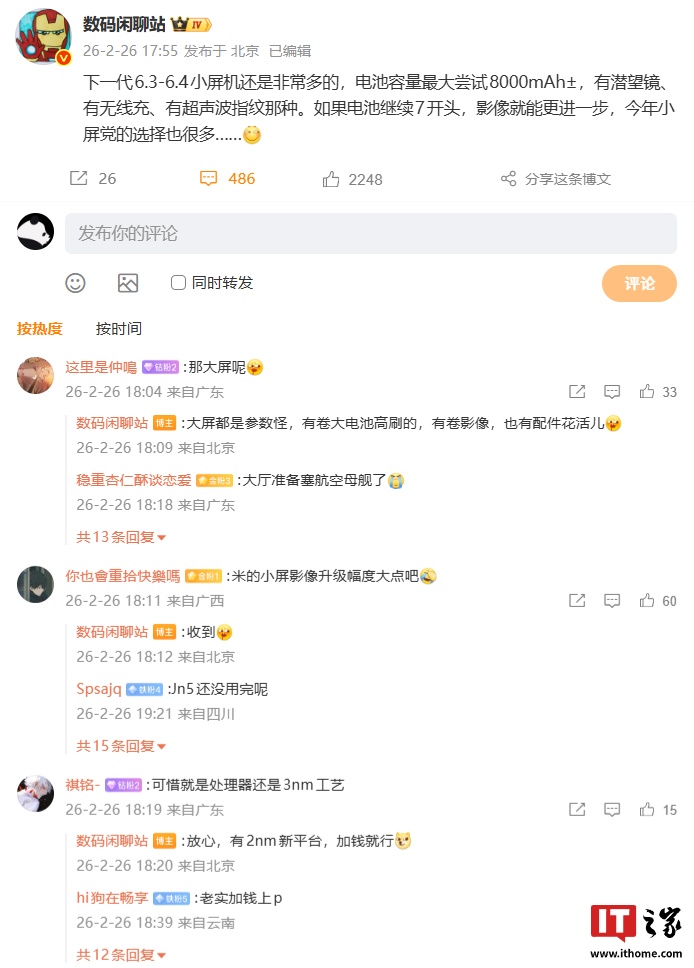 有网友询问大屏新机配置如何,博主回复称:“大屏都是参数怪,有卷大电池高刷的,有卷影像,也有配件花活儿。”还有网友为处理器还是 3nm 工艺感到遗憾,博主表示:“放心,有 2nm 新平台,加钱就行。”