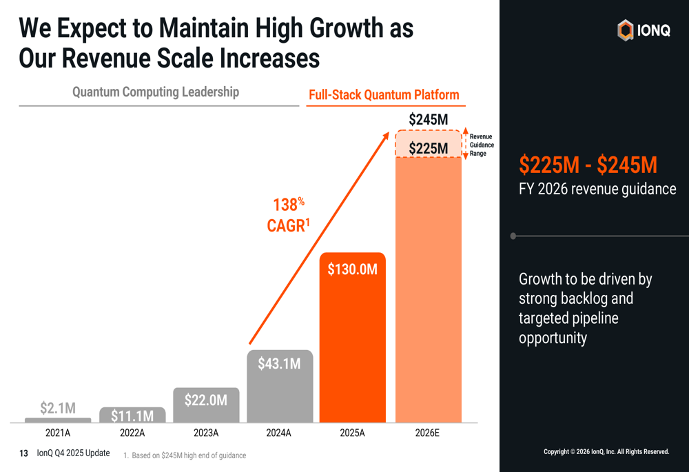 IonQ提供了2026年营收指引:2.25亿美元至2.45亿美元,预示着持续的强劲增长。其中,2026年第一季度营收预计为3650万美元,第二季度营收预计达到4300万美元。
