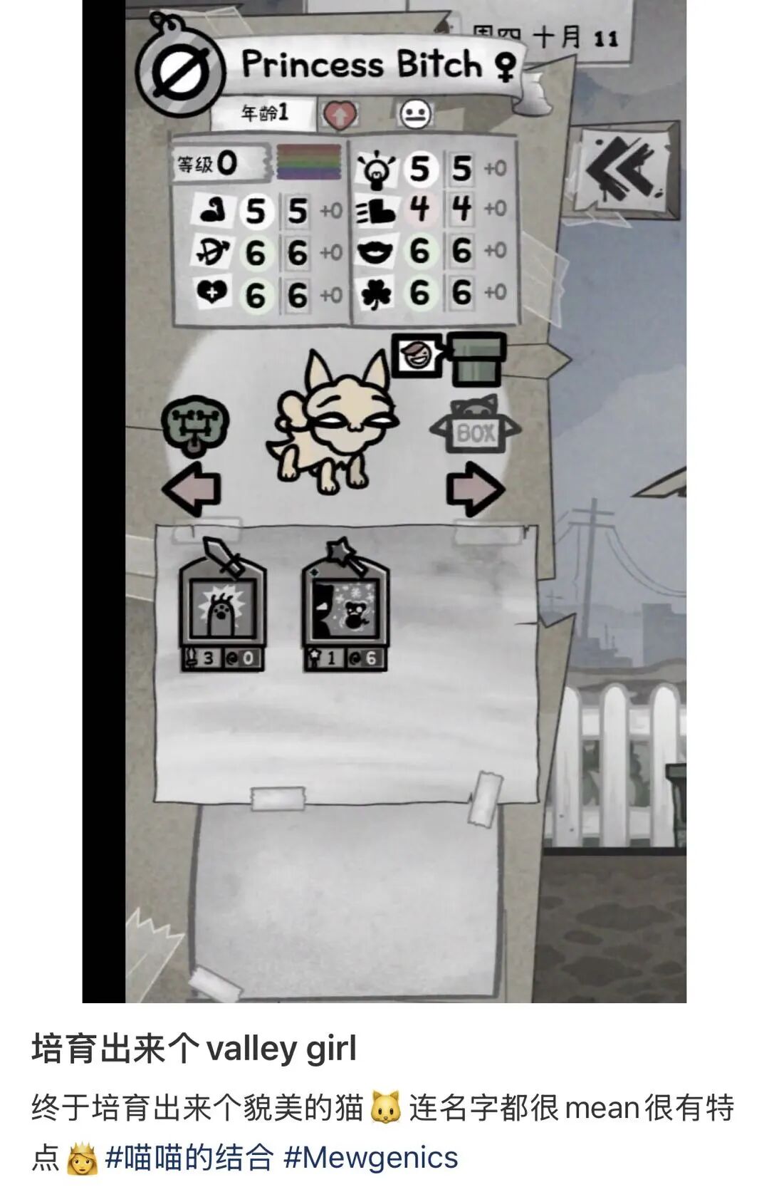 只要玩家愿意,猫咪繁殖完全可以不看技能和数值。社交媒体上,已经能看到玩家只看父母猫的外貌条件、以高颜值小猫为目标的培育玩法。