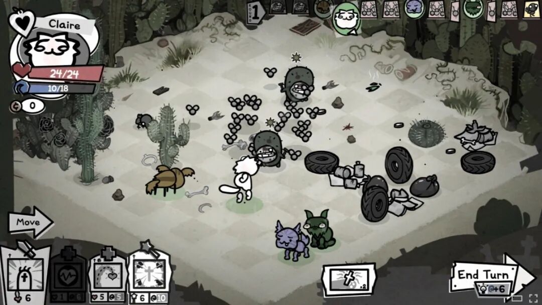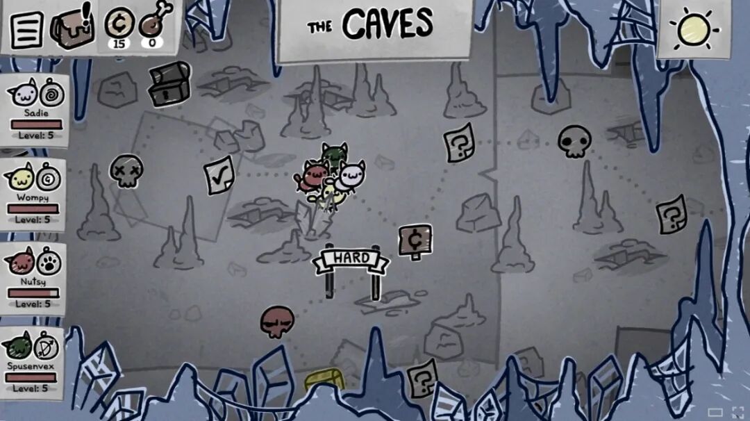 每局开始时,玩家需要派出4只猫咪出战。就像《博德之门》等ARPG一样,猫咪们会戴上象征“战法牧盗”等职业的项圈,获得对应的技能属性。只不过,接下来并没有捏人环节对技能属性的精挑细选,而是猫咪们带着随机技能直接开始远征。