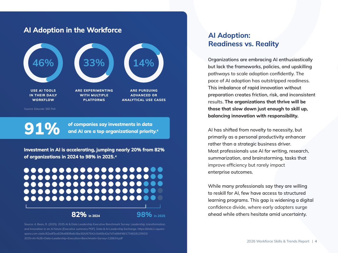 报告基于Educate 360于2025年1月至10月对超过1000名专业人士的调研,勾勒出一幅处于转型十字路口的劳动力图景。数据显示,98%的组织在2025年已投资AI,较2024年的82%大幅提升,91%的企业将数据与AI列为最高优先级。然而,技术推进速度显著快于组织在人才、流程与治理上的准备度,形成清晰的“采用率高、成熟度低”结构性矛盾。几乎所有受访者都尝试过AI工具,但缺乏制度化流程与清晰治理框架,使创新更多停留在个体效率层面,而非企业级价值创造。